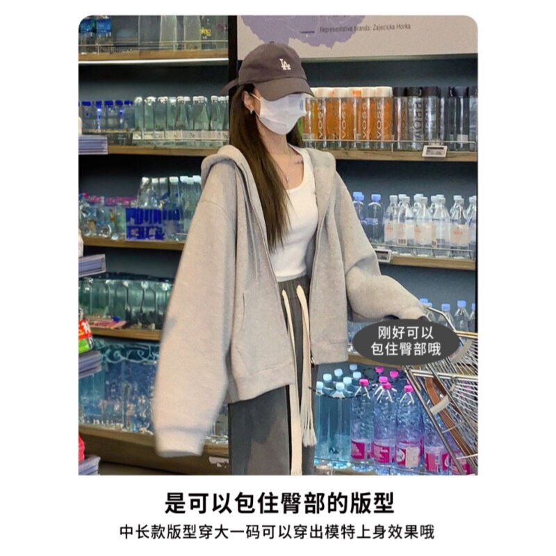 灰色卫衣外套女款连帽开衫2026新款早秋宽松拉链冬季加绒加厚上衣