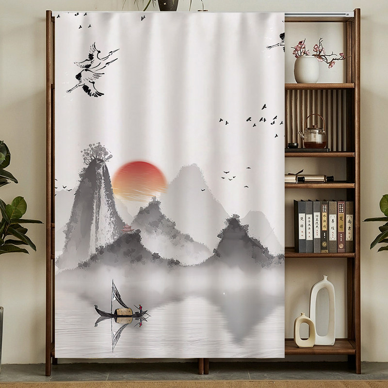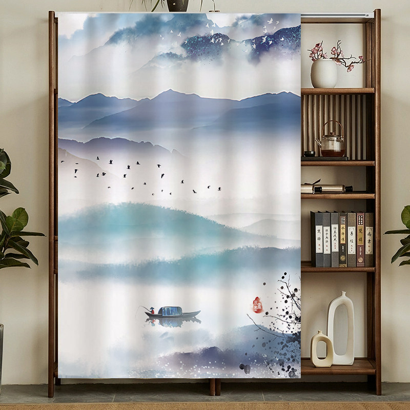 国风山水画柜子遮挡帘免打孔滑轨衣柜门帘书柜防尘帘置物架遮丑帘