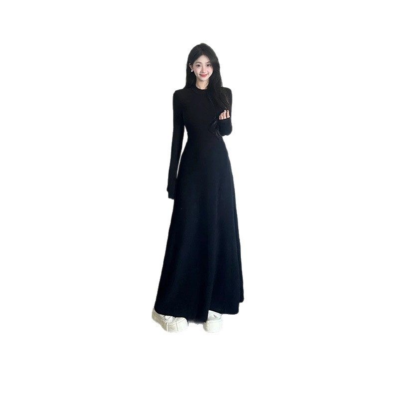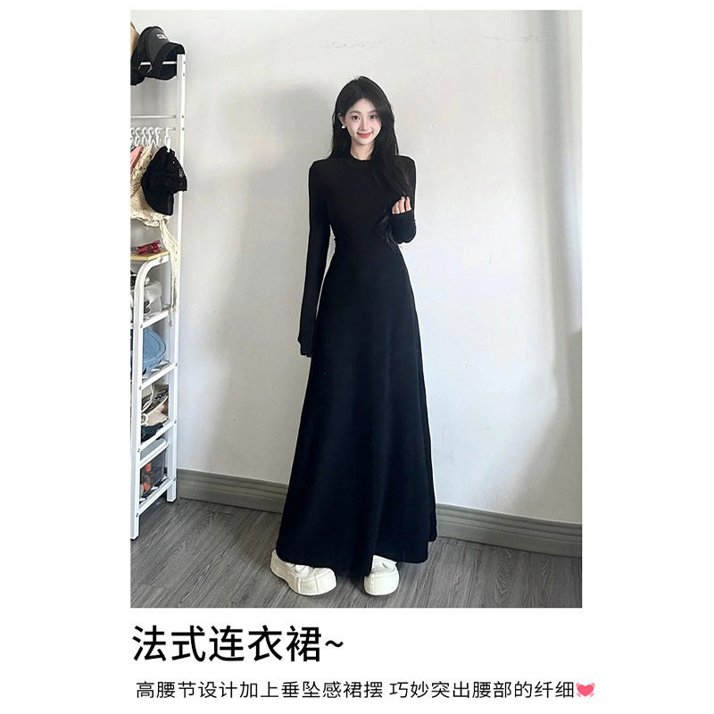 黑色裙子女春秋针织修身连衣裙长款打底裙收腰显瘦拼接长裙赫本风