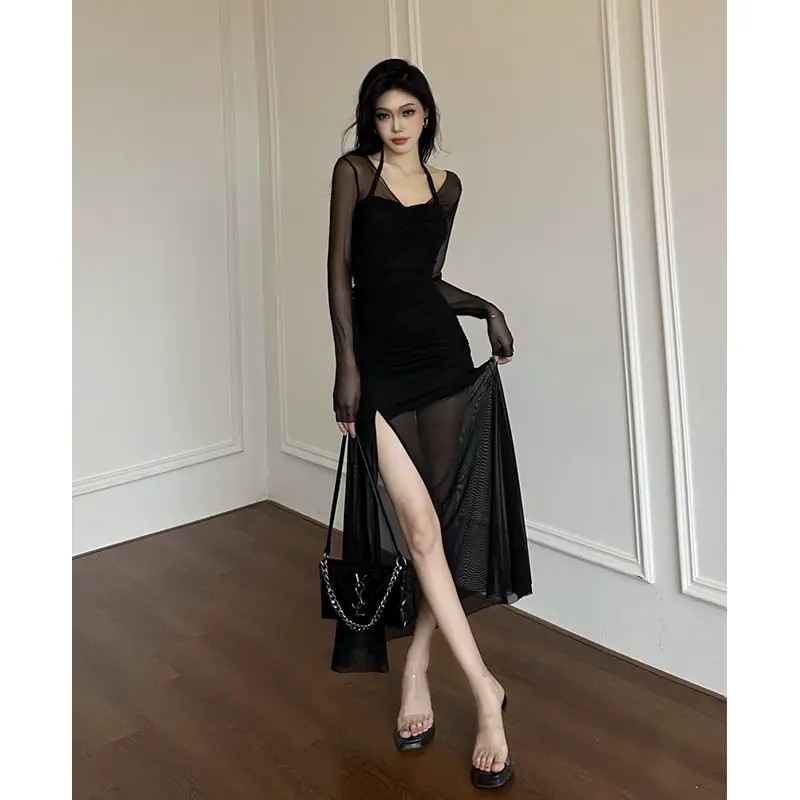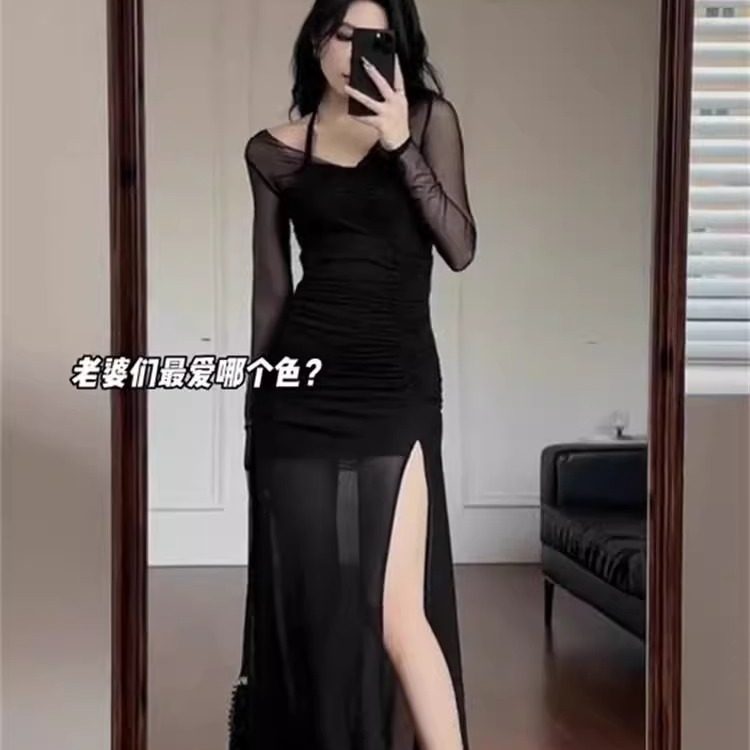 纯欲高级感黑色挂脖吊带连衣裙女夏季辣妹修身收腰开叉网纱长裙子