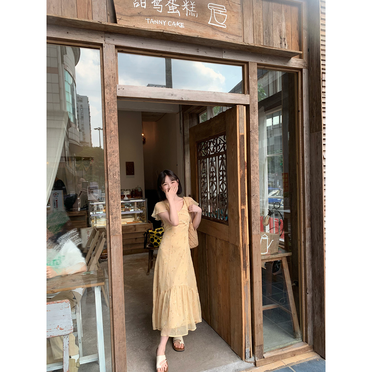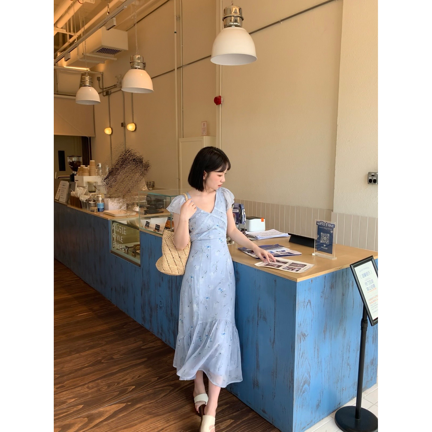 板栗西西【三色】法式甜美V领碎花收腰夏日巨好看连衣裙女小个子