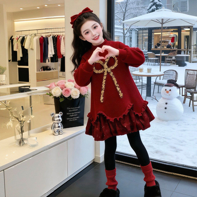 女童加绒连衣裙新年连衣裙冬装儿童加绒加厚公主裙子红色过年战袍