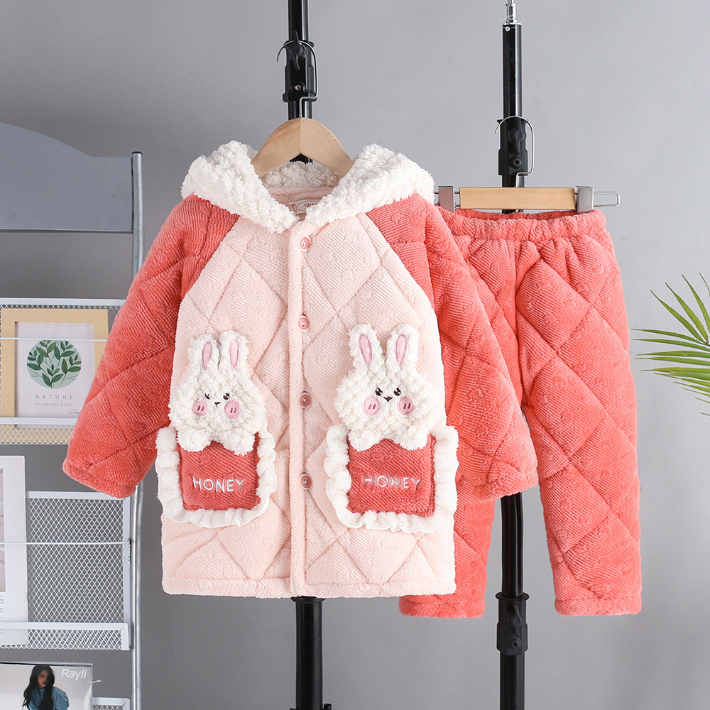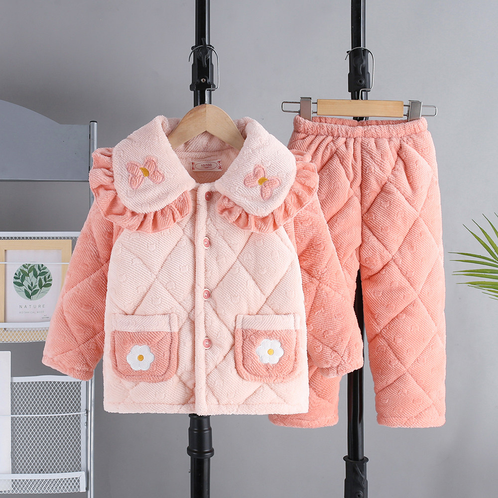 冬季女孩牛奶绒三层夹棉厚睡衣 中长款女童加绒加厚家居服套装
