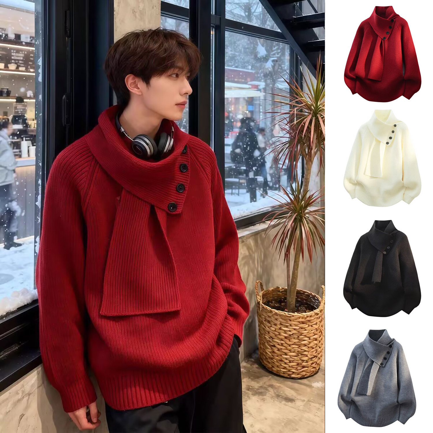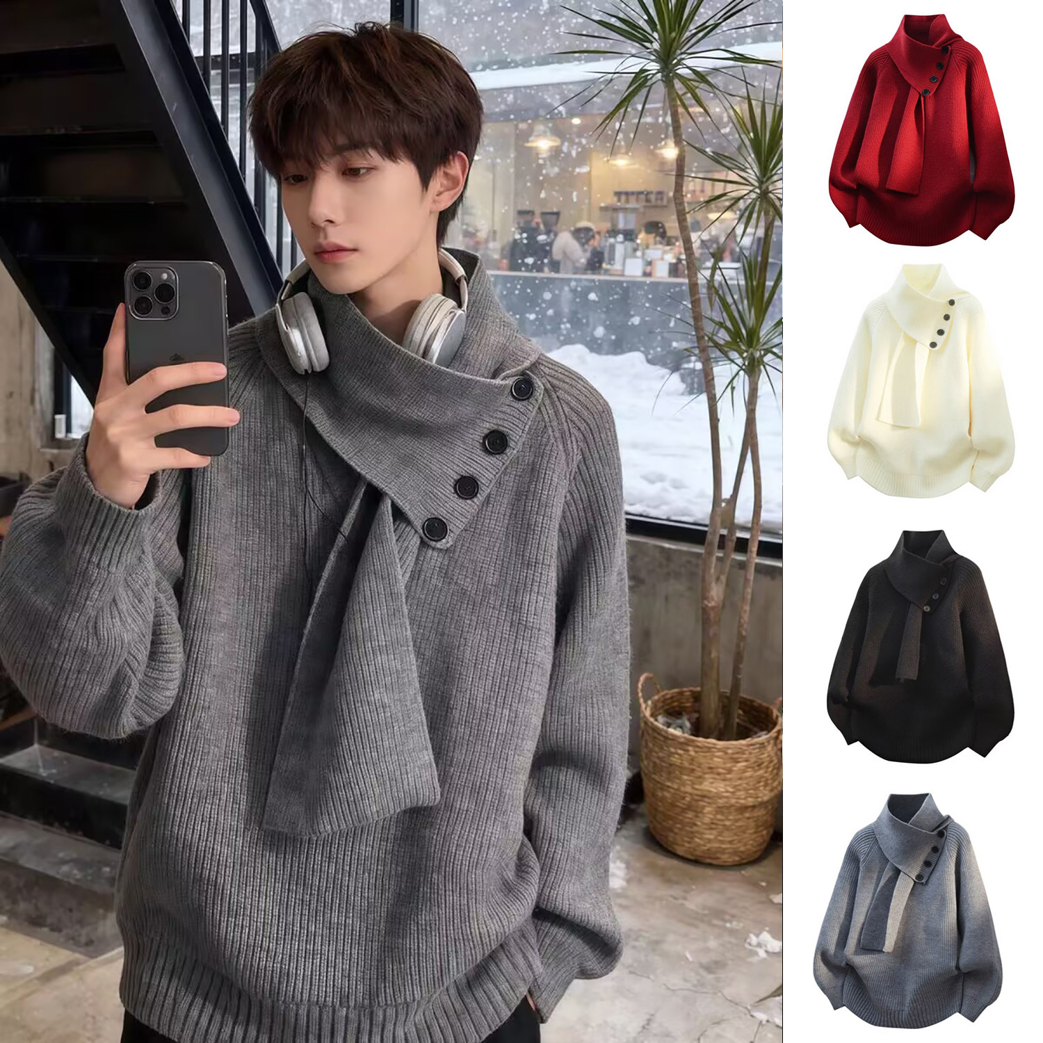 毛衣男款秋冬季青少年慵懒风情侣半高领打底针织衫可脱卸围巾线衣