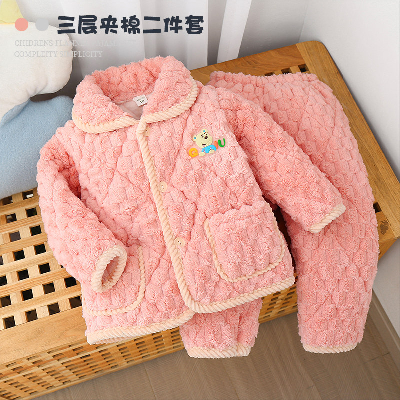 冬款儿童法兰绒睡衣套装男大童女童三层夹棉加绒加厚珊瑚绒家居服