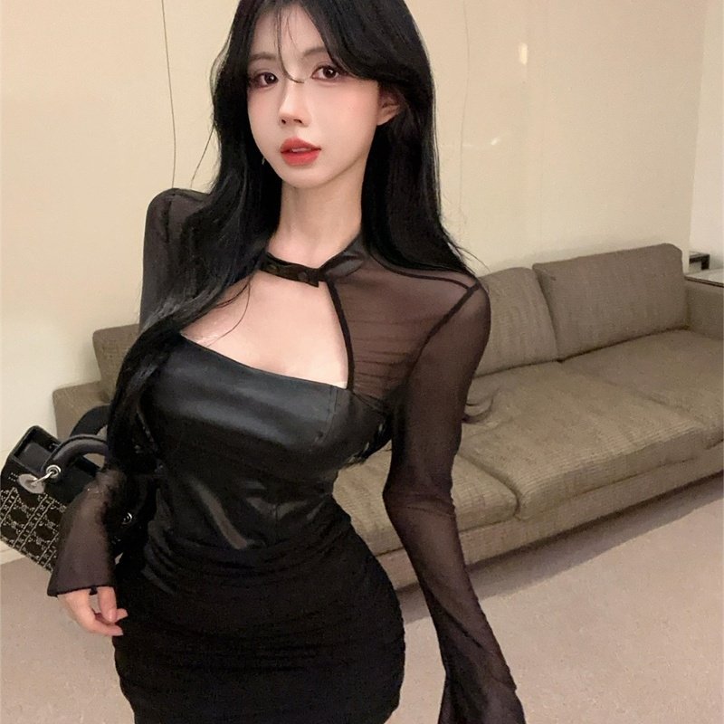 大码女装胖mm法式气质黑色网纱皮质拼接包臀纯欲辣妹短款连衣裙