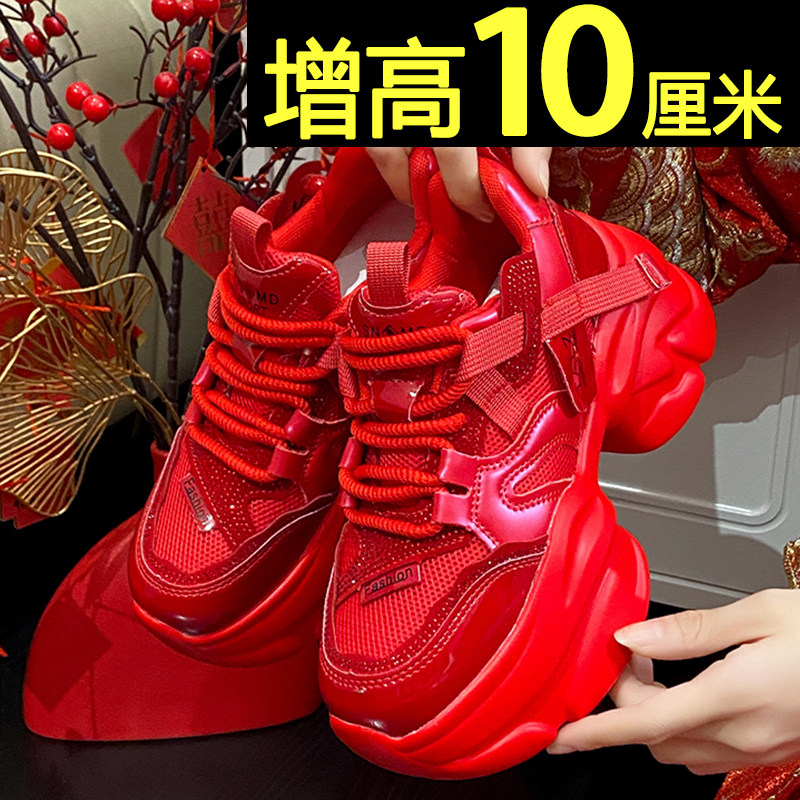 厚底老爹鞋女款2025新款秋冬季加绒女鞋10cm内增高婚鞋红色松糕鞋