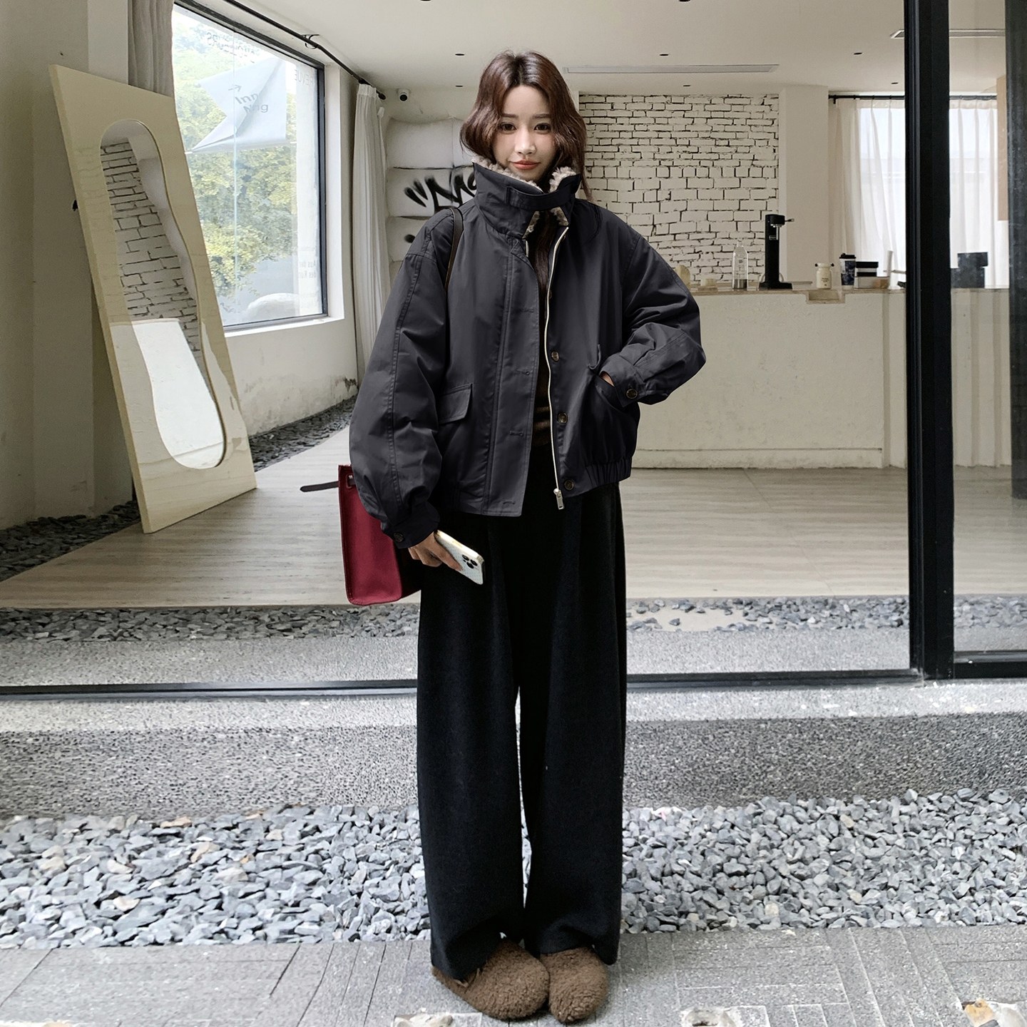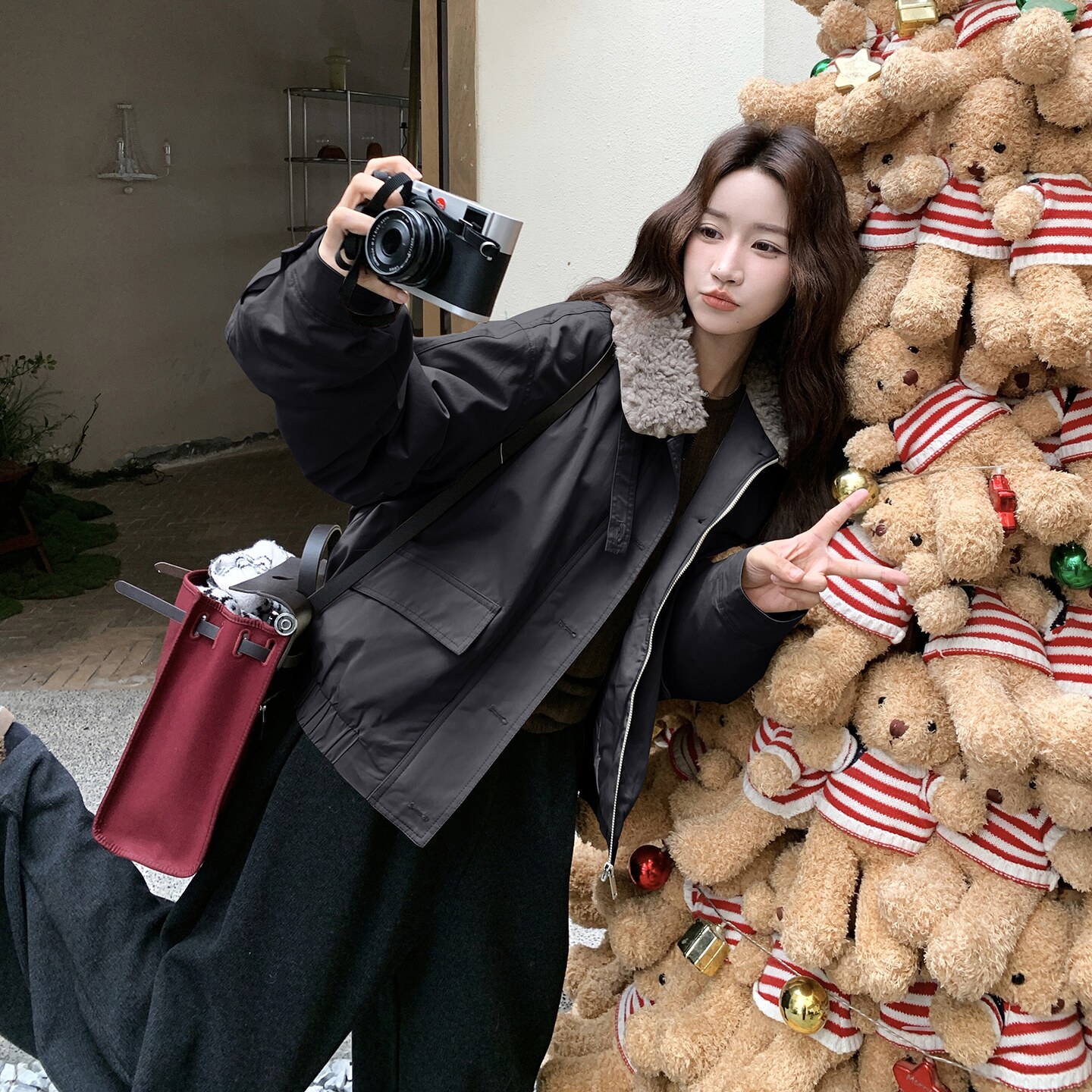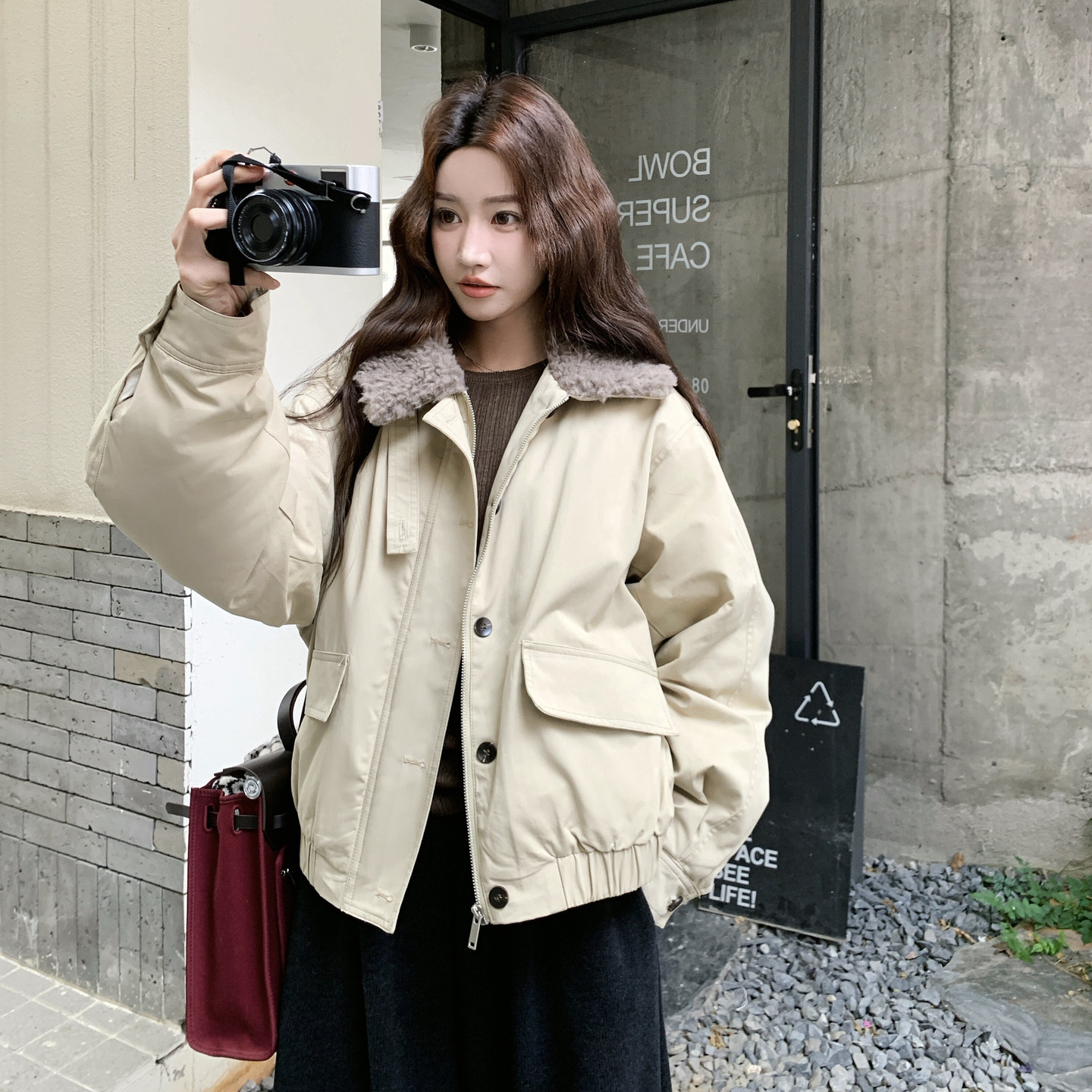 卡其色奶呼呼毛绒拼接领羽绒服女2025冬季新款韩版工装短款派克服