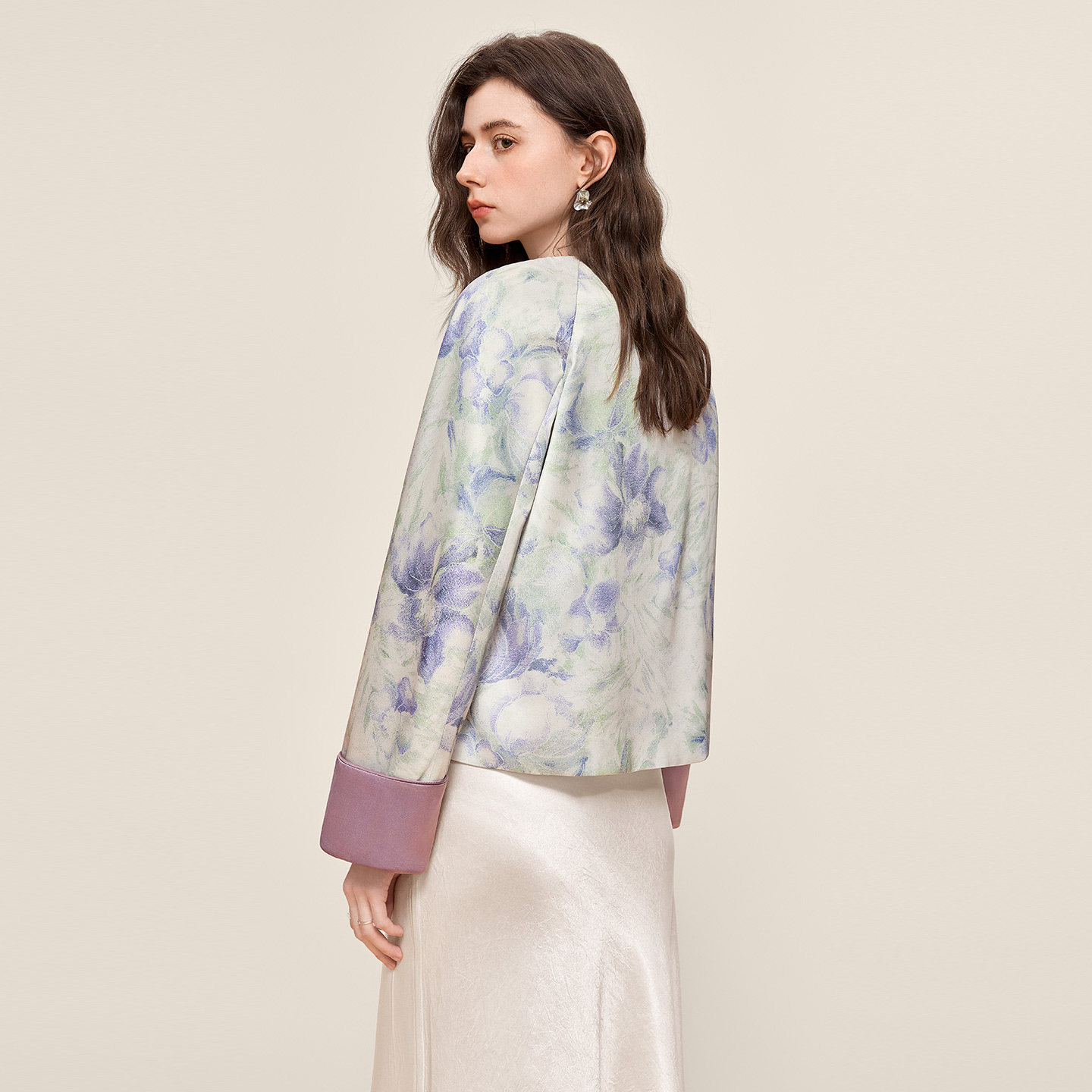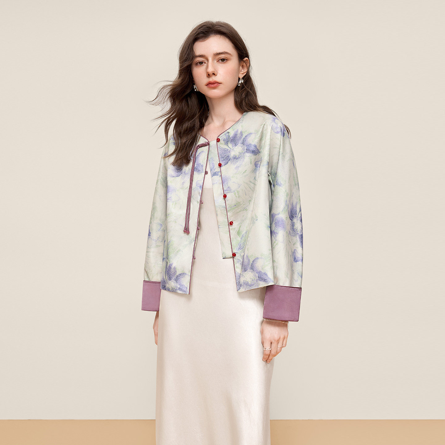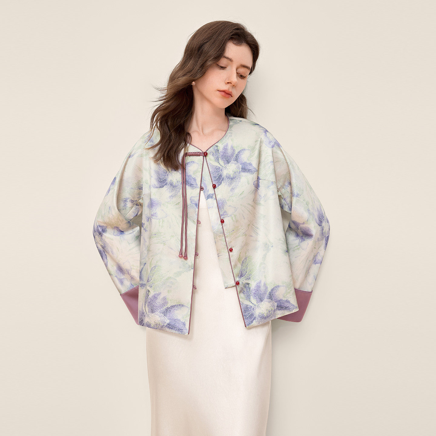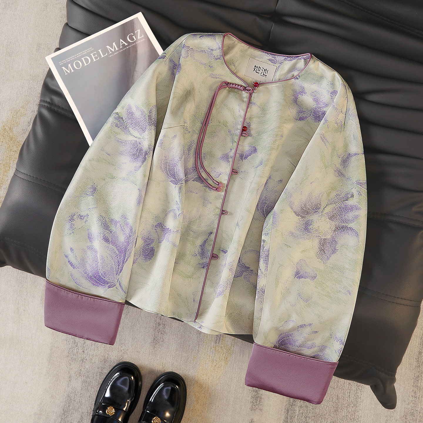 她池新中式外套2026春装新款女装宽松款国风印花单排扣圆领上衣