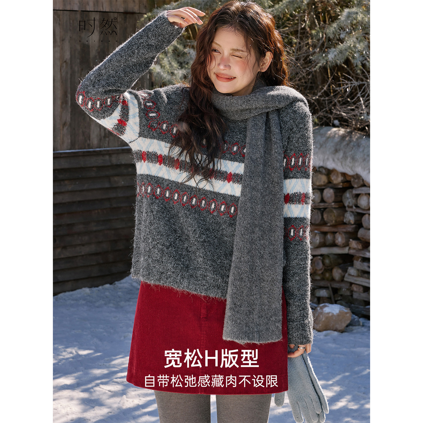 时然大码复古撞色针织衫宽松毛衣上衣新款冬装胖mm女装洋气打底衫