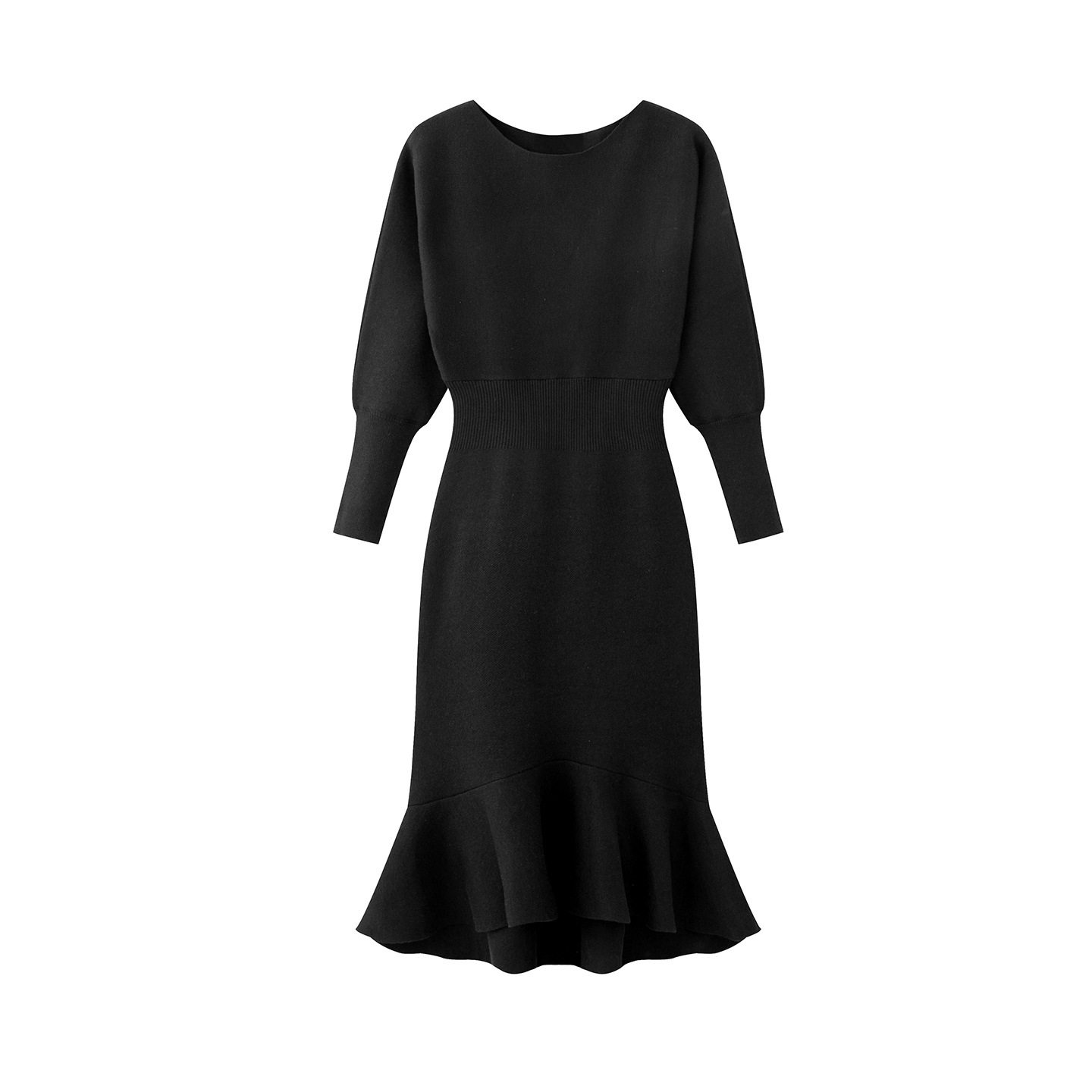 赫本风黑色内搭打底针织连衣裙配大衣修身长款毛衣鱼尾裙女小香风