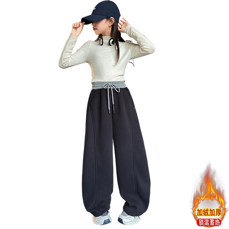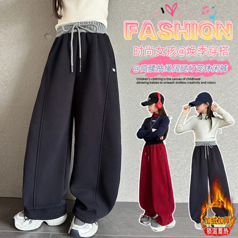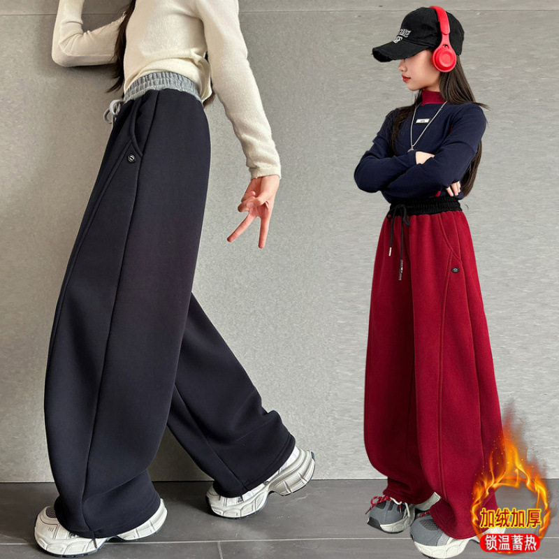女童加绒裤子秋冬装女大童加厚弯刀裤女孩红色新年裤初中生运动裤