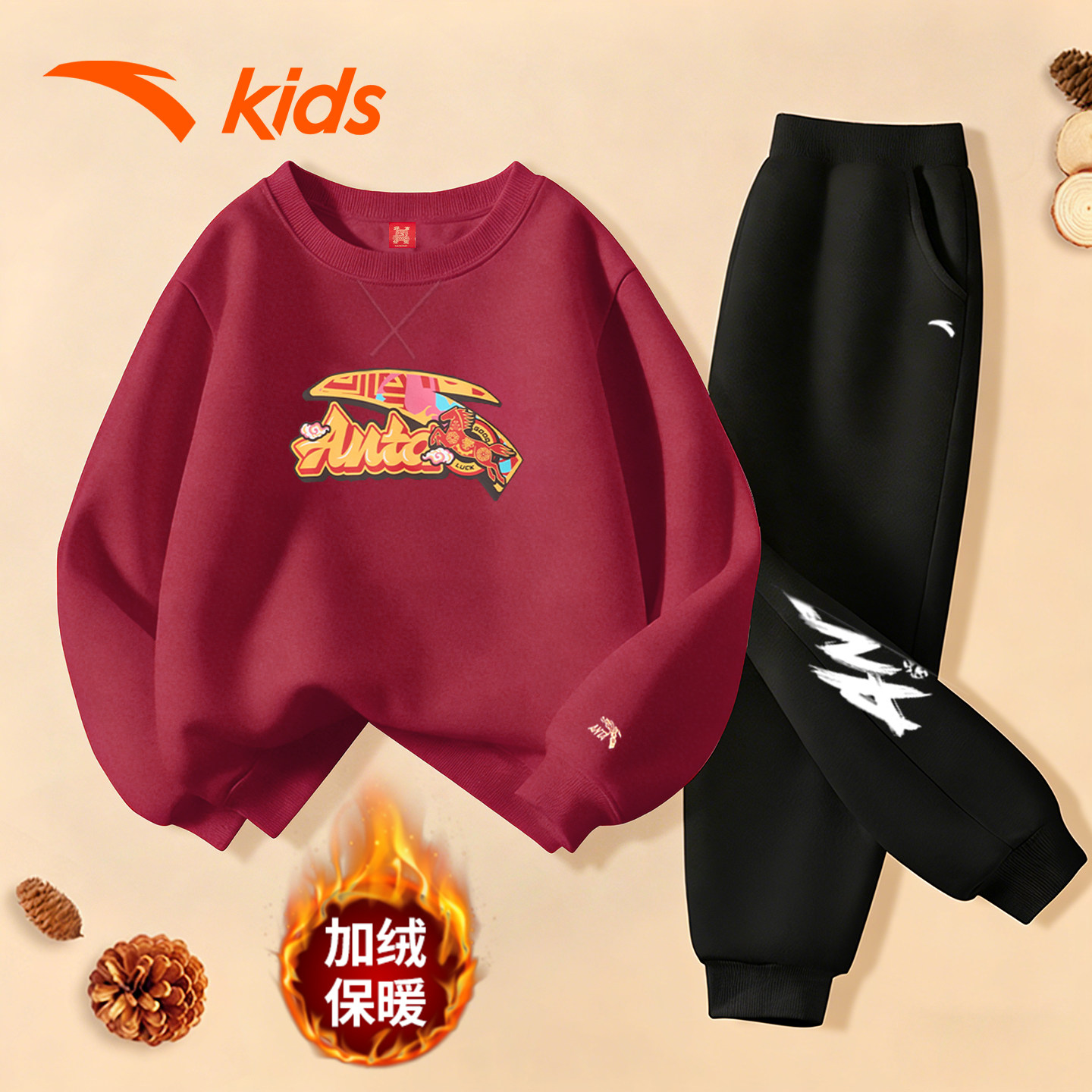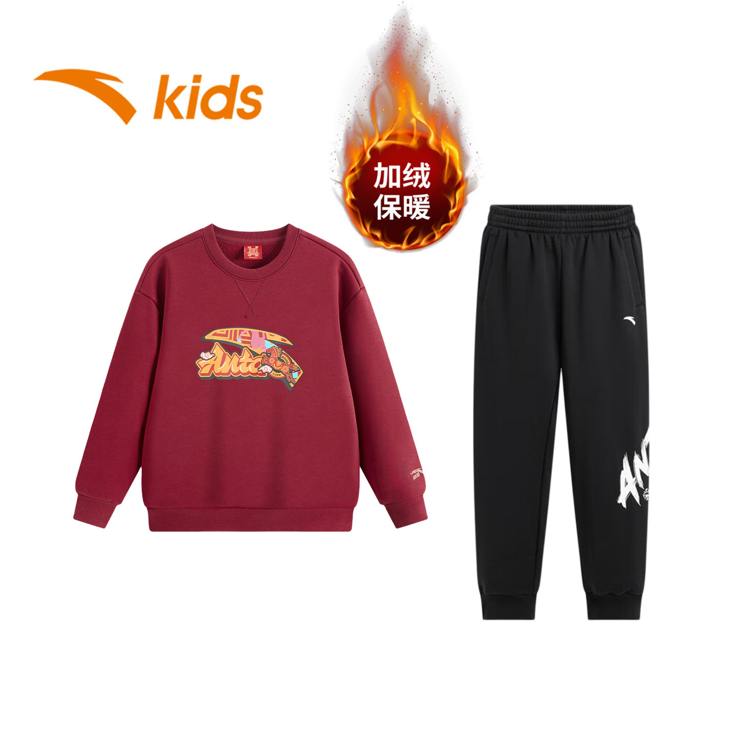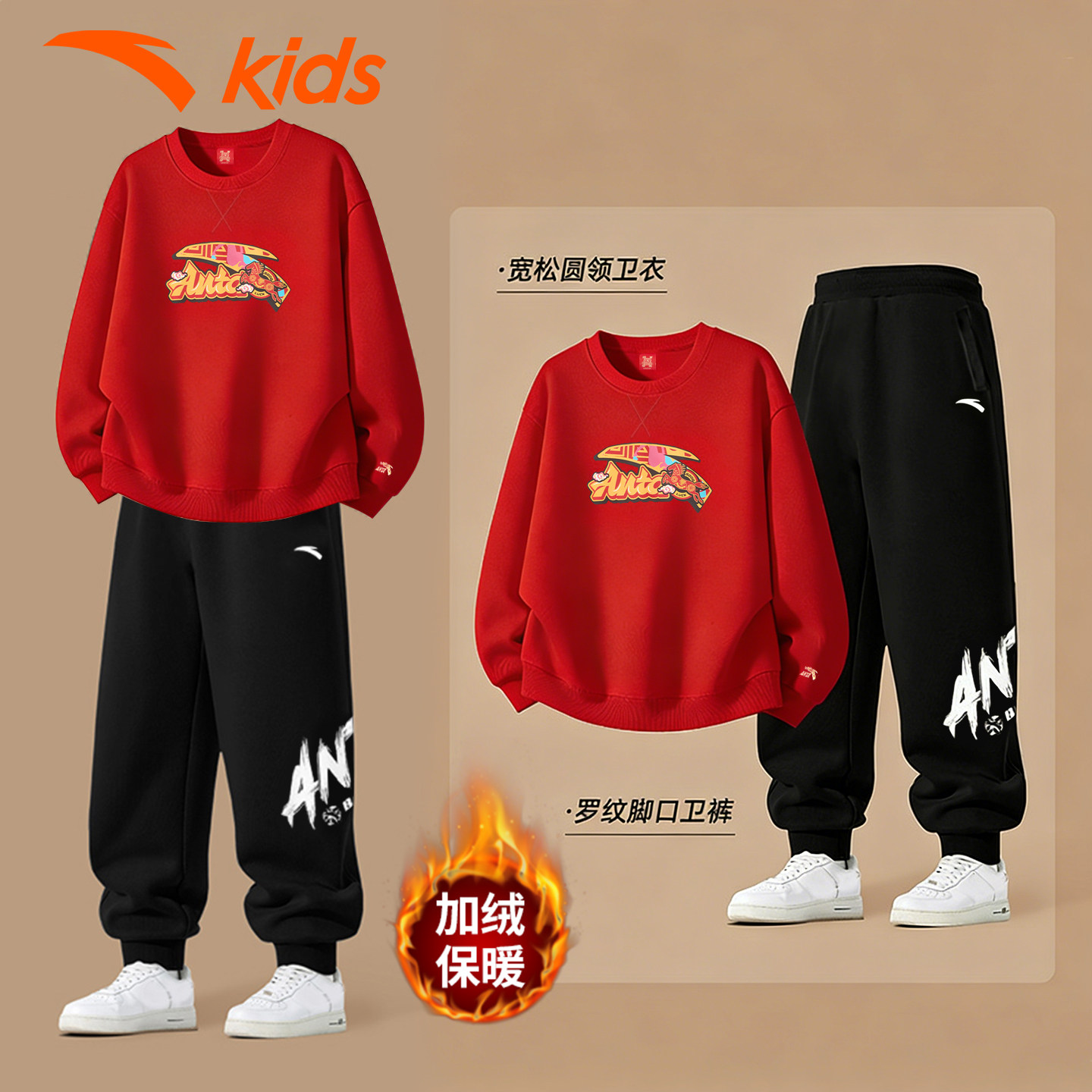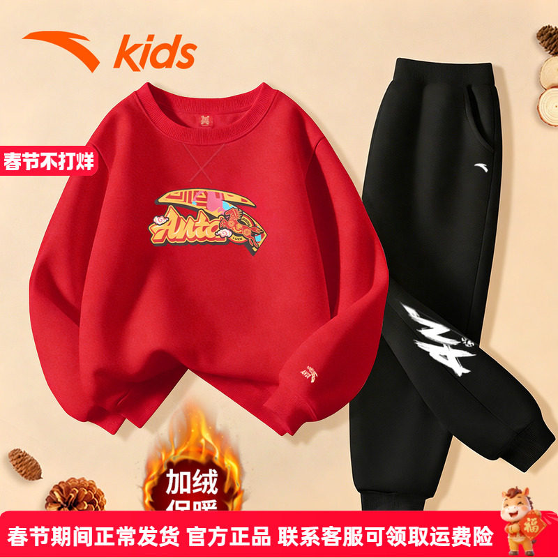 安踏儿童童装红色新年卫衣男童运动套装2026加绒保暖裤儿童拜年服