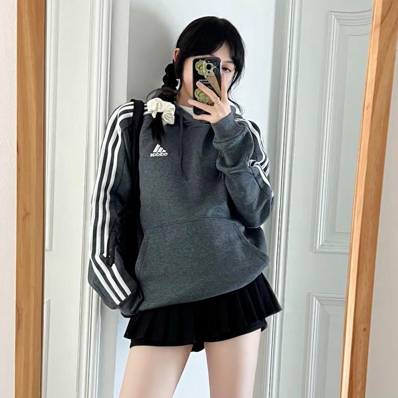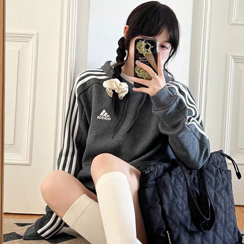 阿迪达斯灰色卫衣女冬季新款加绒连帽美式复古棒球宽松上衣运动服