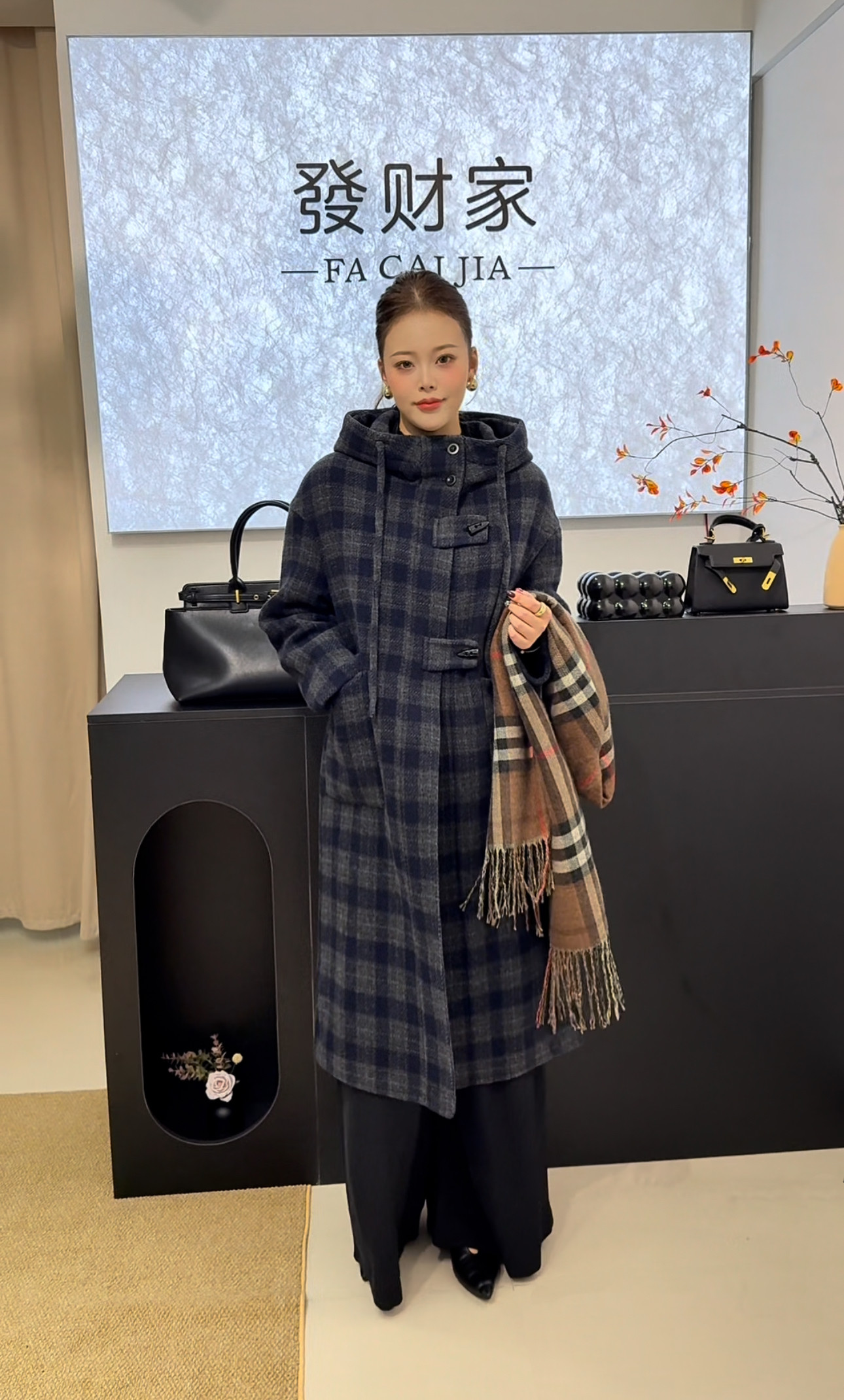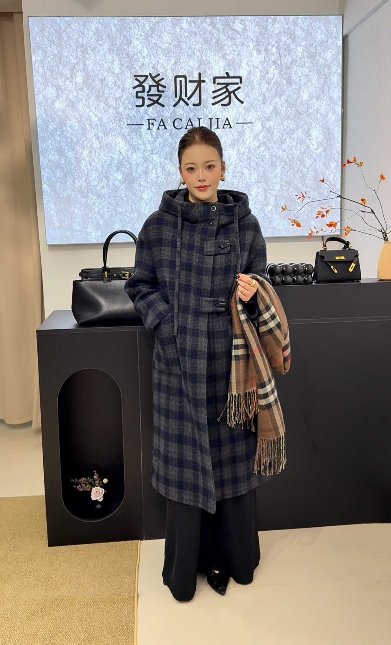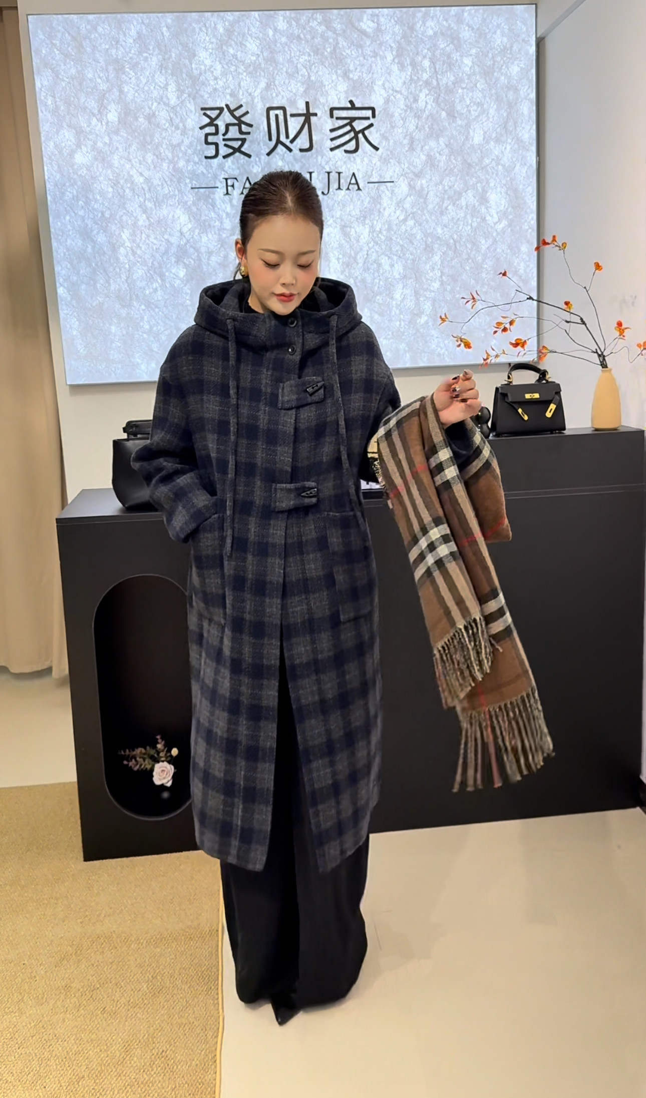 2026年早春新款连帽格子双面羊毛大衣女中长款显瘦羊毛呢子外套女