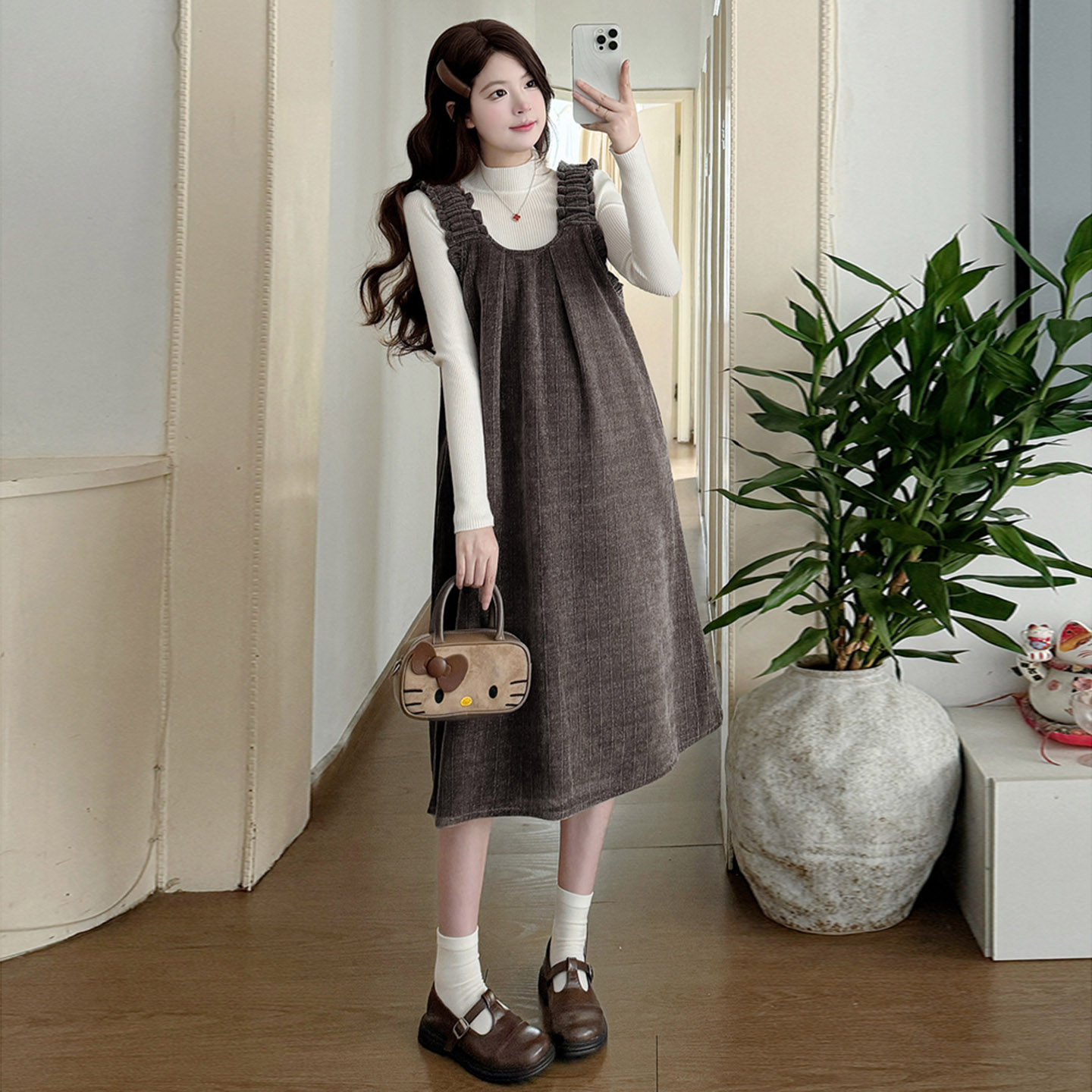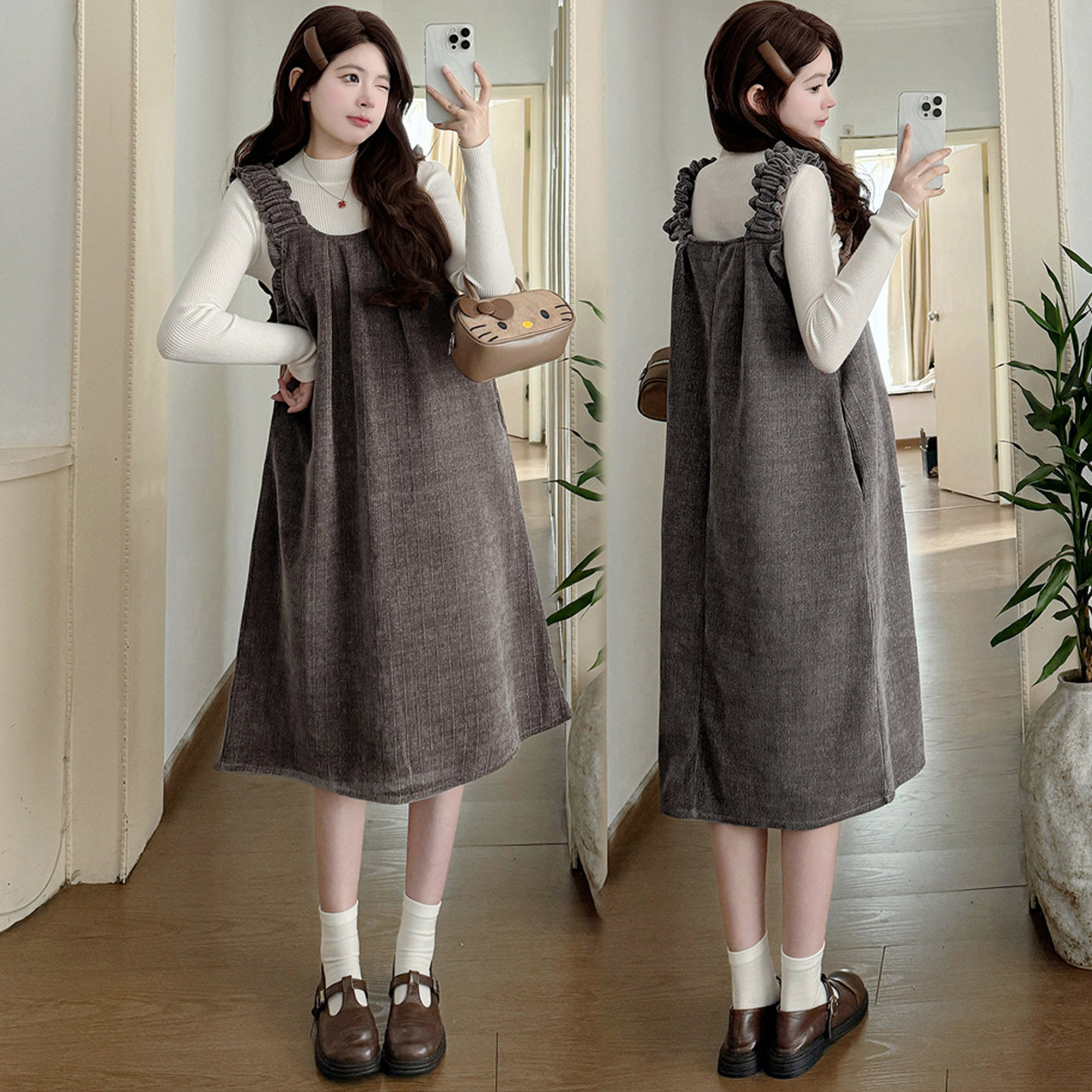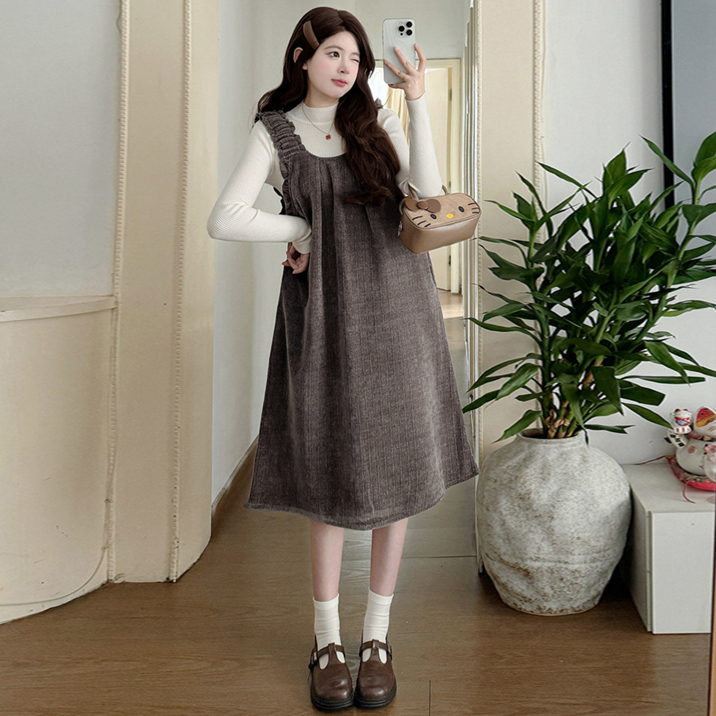 孕妇背带裙套装春秋新款小个子孕妇装针织打底衫外穿中长款连衣裙