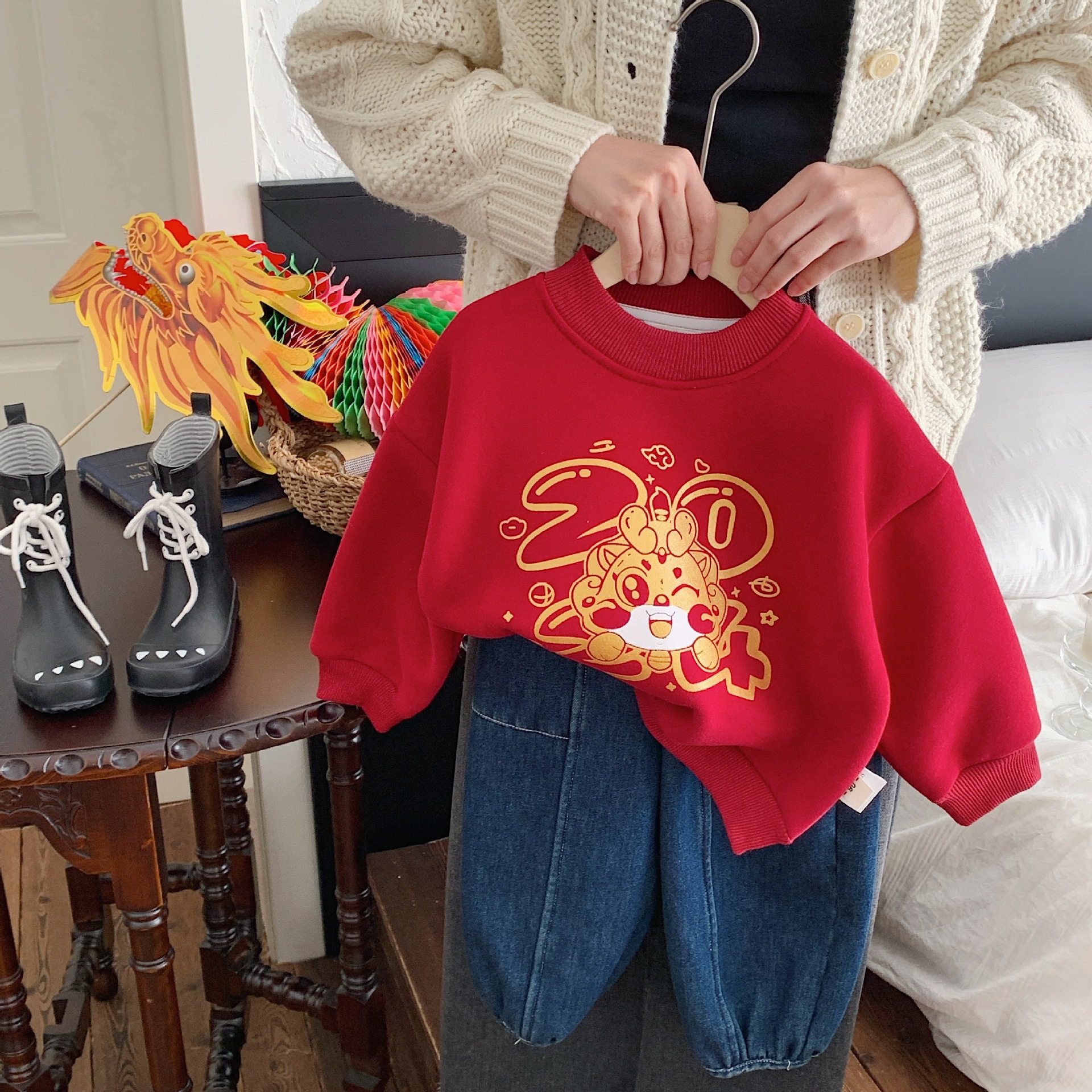 儿童卫衣2025冬款男童中国风喜庆新年服上衣加绒拜年服加厚保暖潮