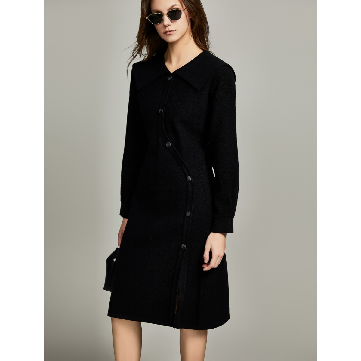 ELLE黑色设计感修身开叉连衣裙女2025冬装新款小众翻领长袖裙子