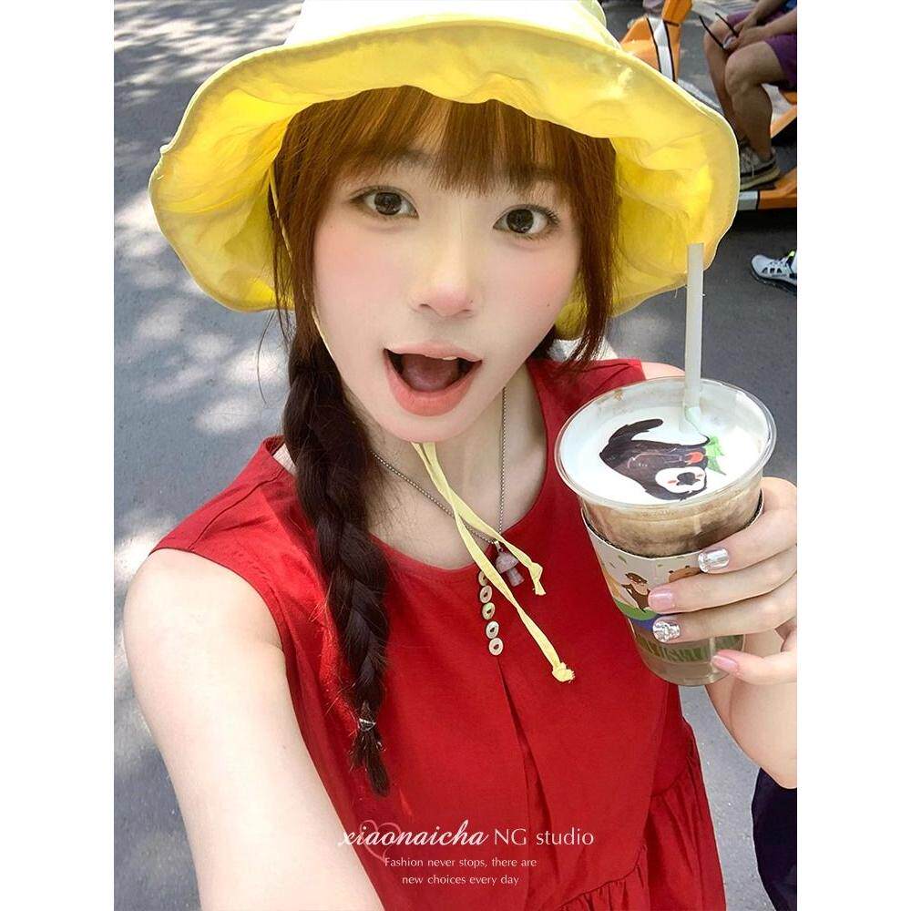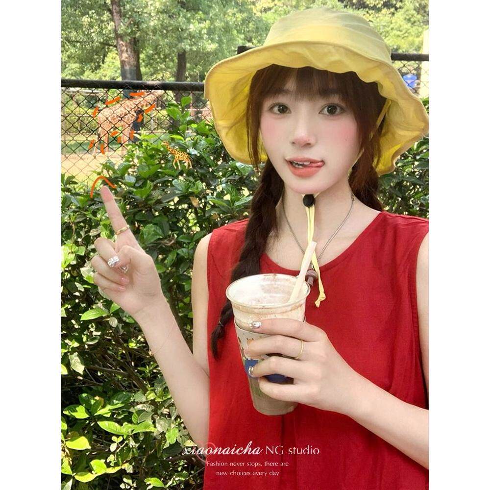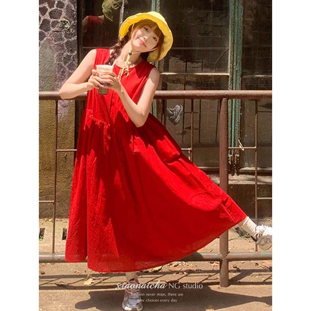 法式复古红色无袖系带背心连衣裙女夏季新款小个子收腰显瘦中长裙