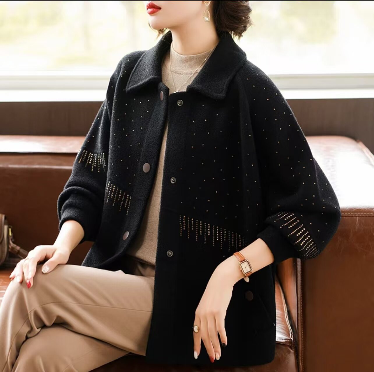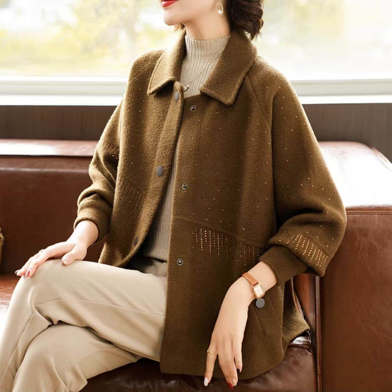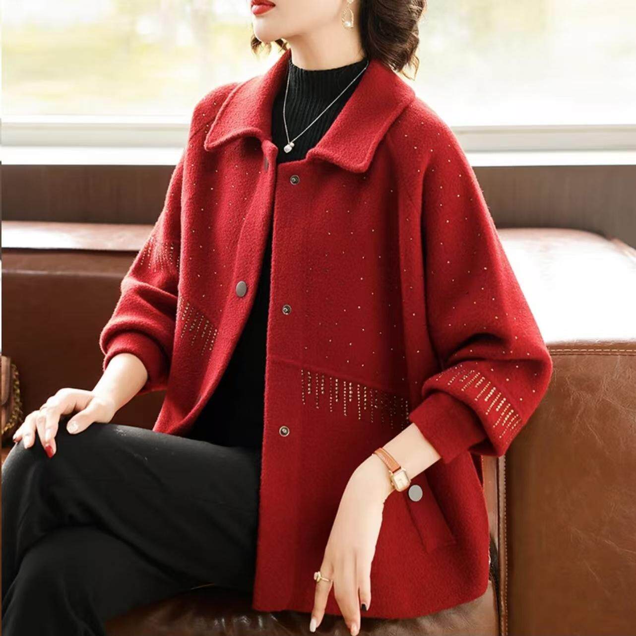 中年妈妈春装洋气短款外套2025新款中老年女春秋时尚针织毛呢上衣