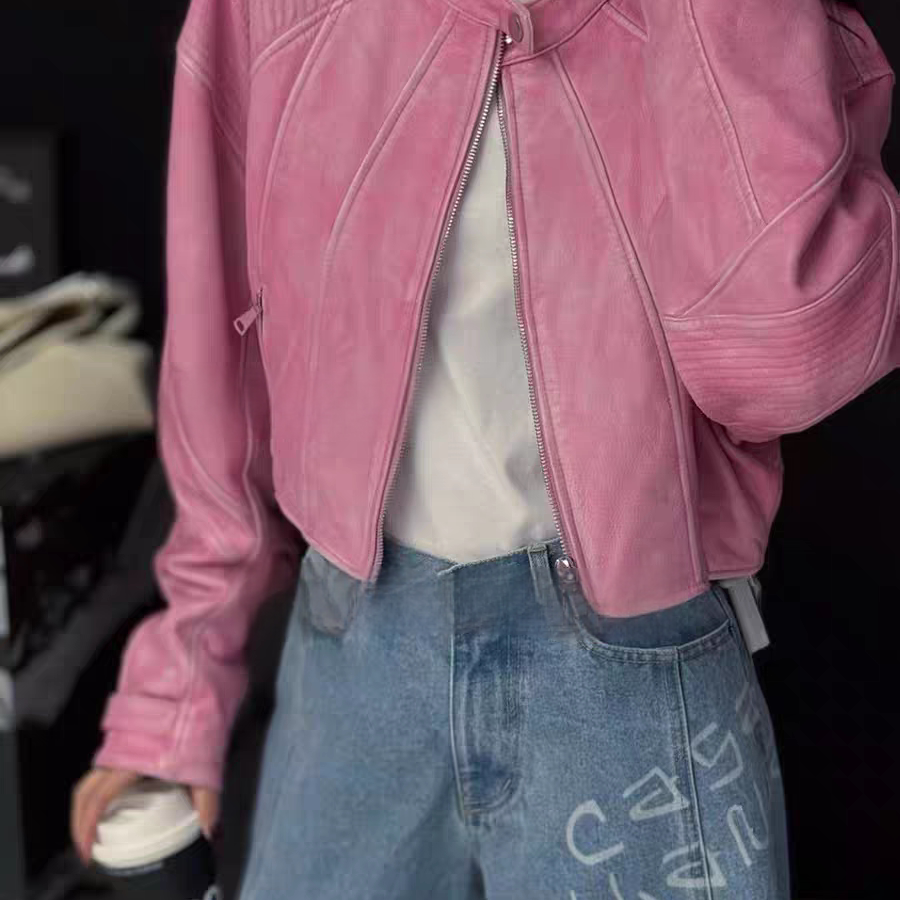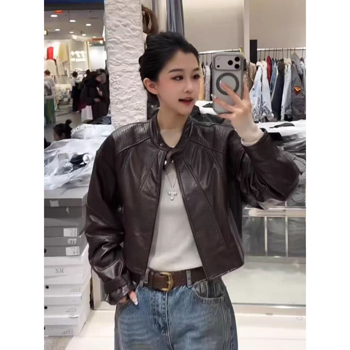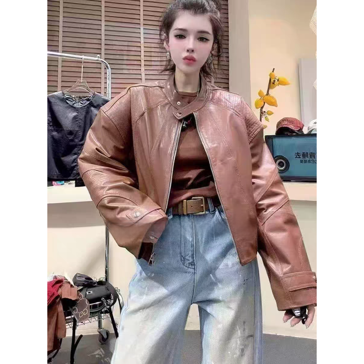 2026春季时尚新款真皮皮衣女款绵羊皮立领短款机车皮夹克宽松外套