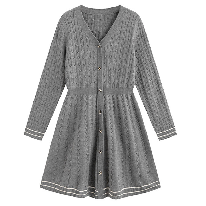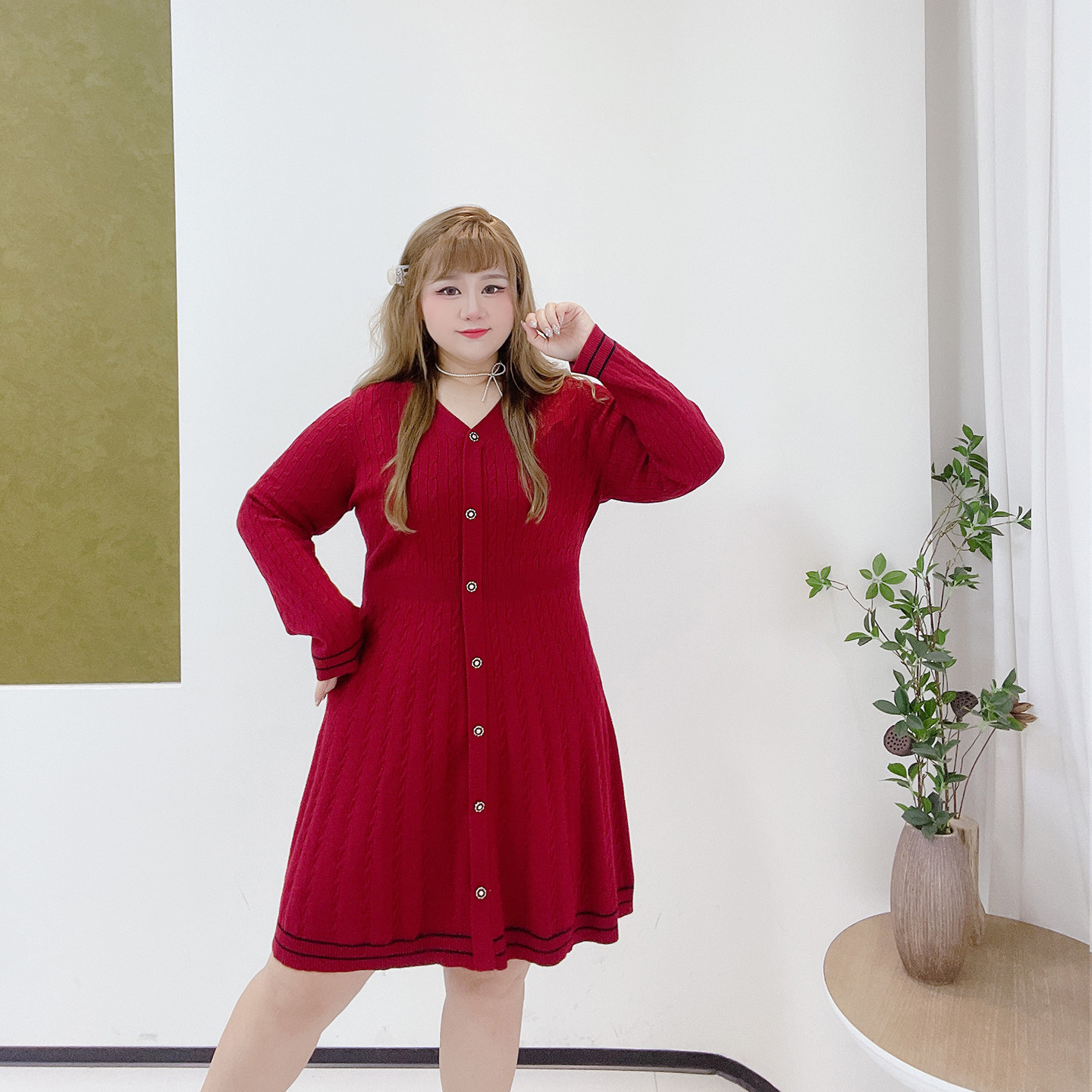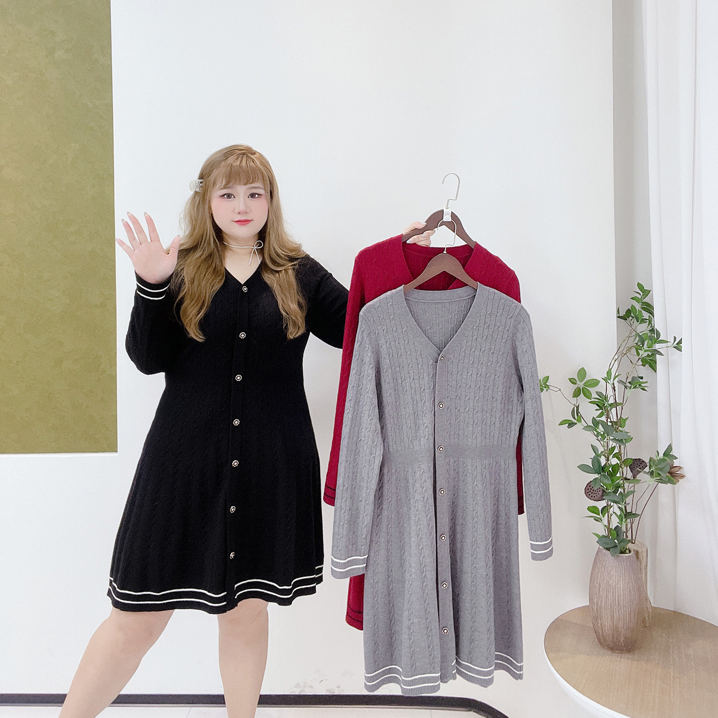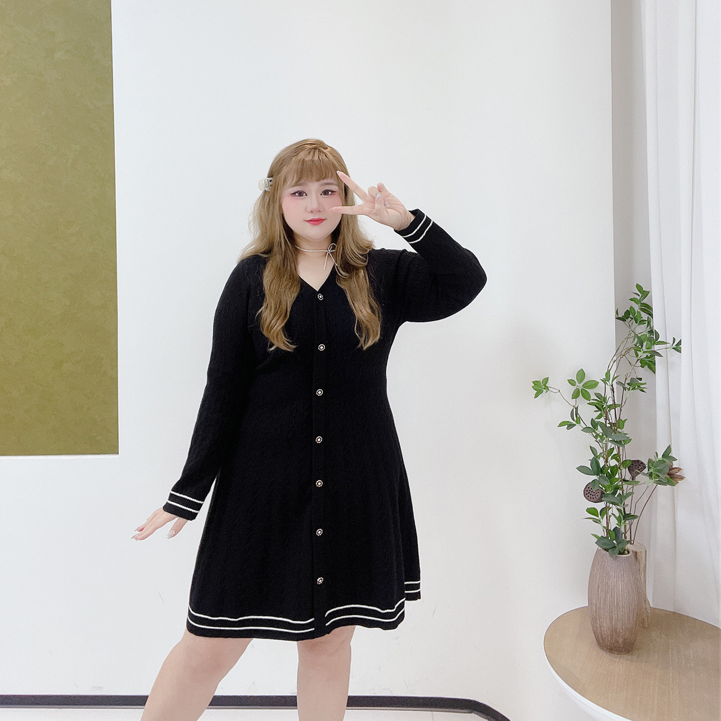 胖莹莹大码女装法式复古V领学院风条纹收腰A字版弹力短款连衣裙