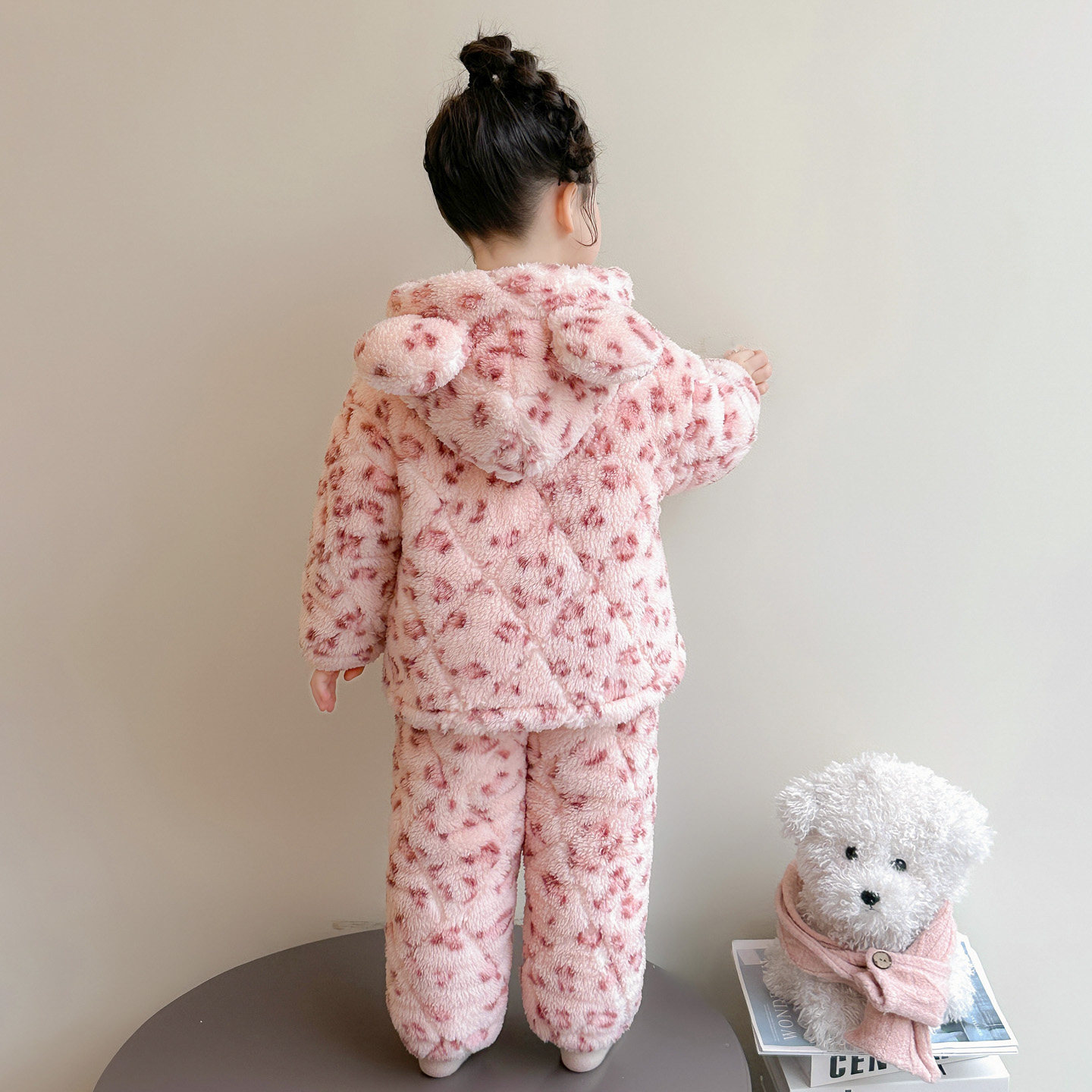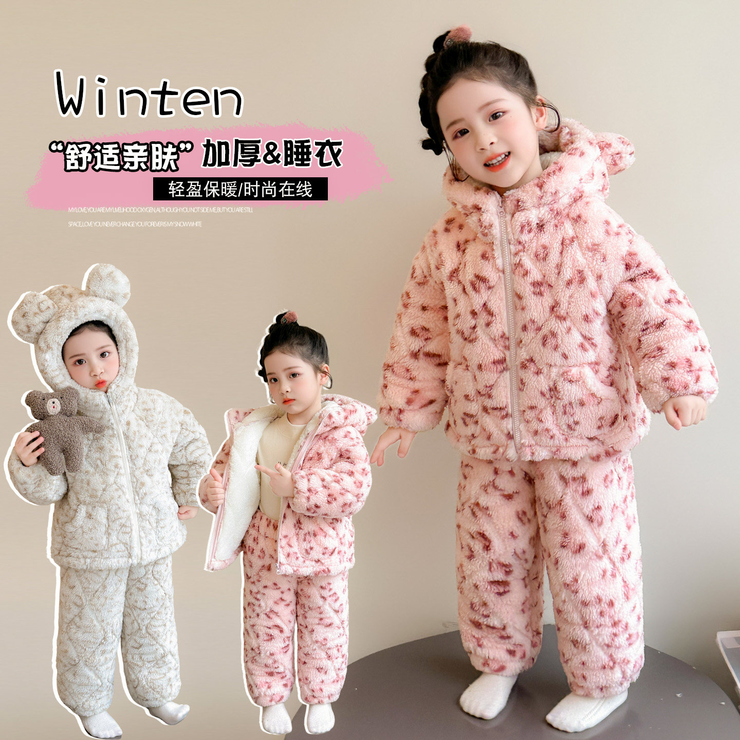 儿童睡衣三层夹棉2025新款豹纹女童冬季加绒加厚连帽家居服套装