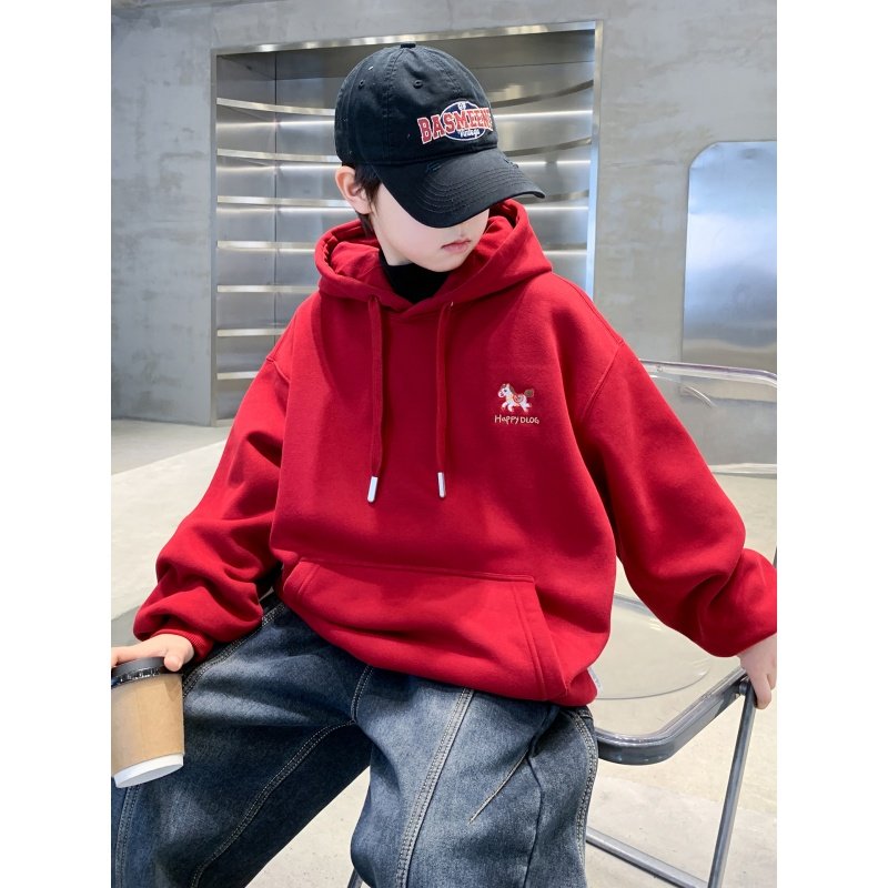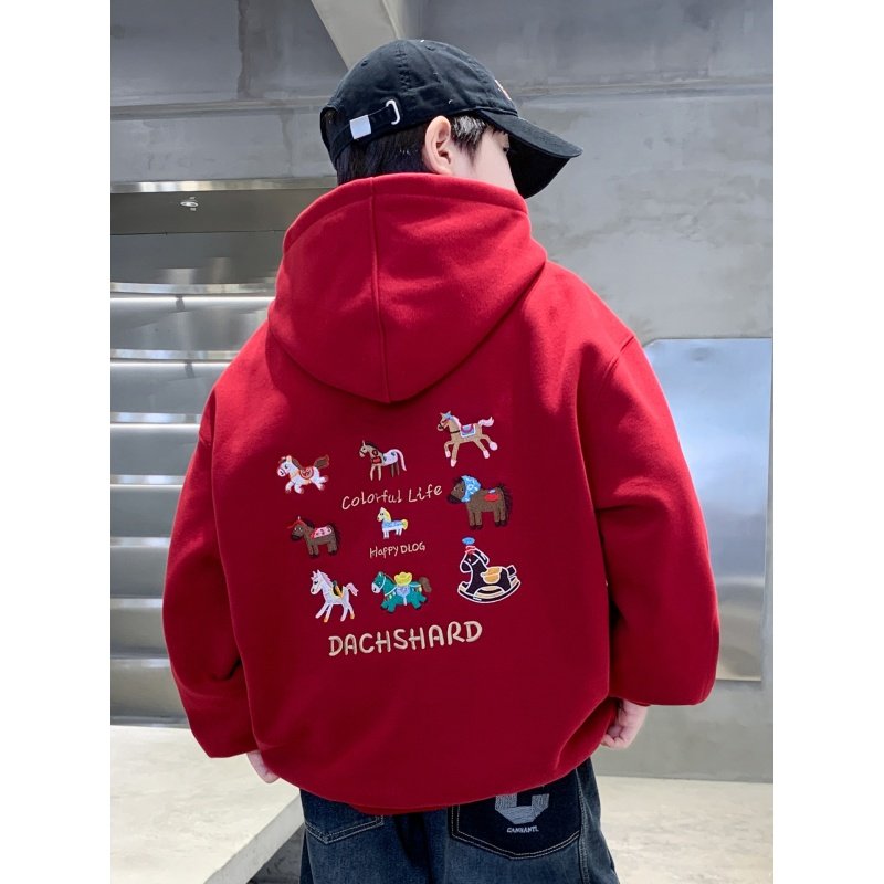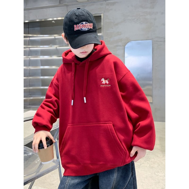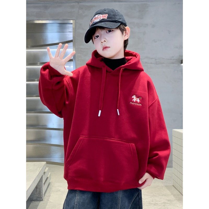 男童冬季红色卫衣拜年服2025新款青少年儿童加绒加厚连帽上衣马年