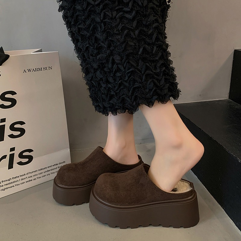 8CM内增高小个子厚底勃肯包头半拖鞋女加绒外穿2025冬毛毛棉拖鞋