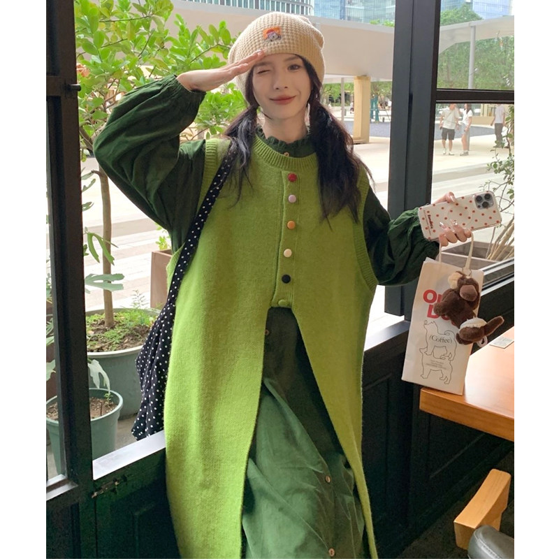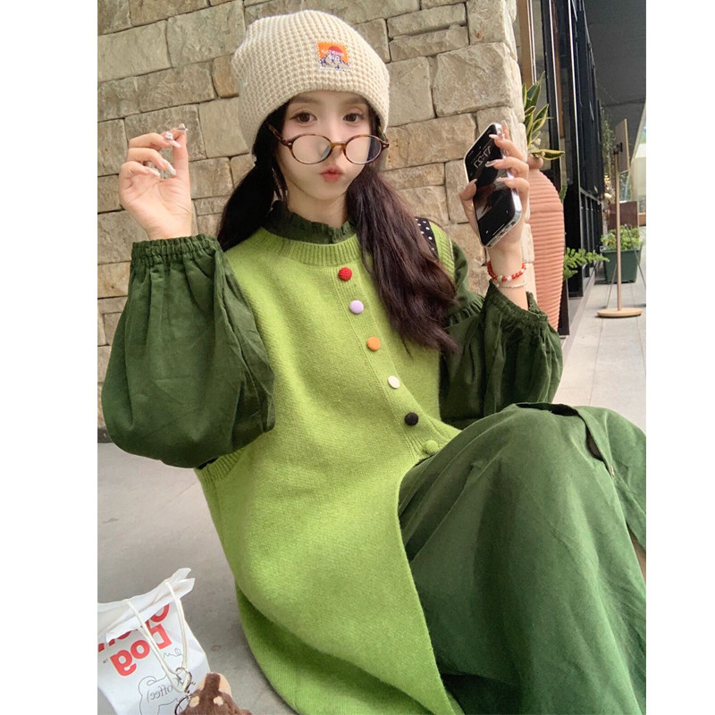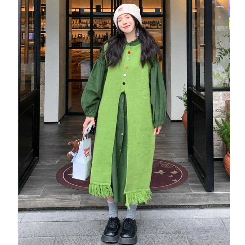 大码女装2025秋冬胖mm木耳边长款连衣裙+叠穿流苏马甲针织连衣裙