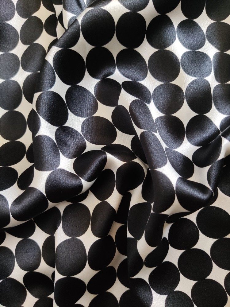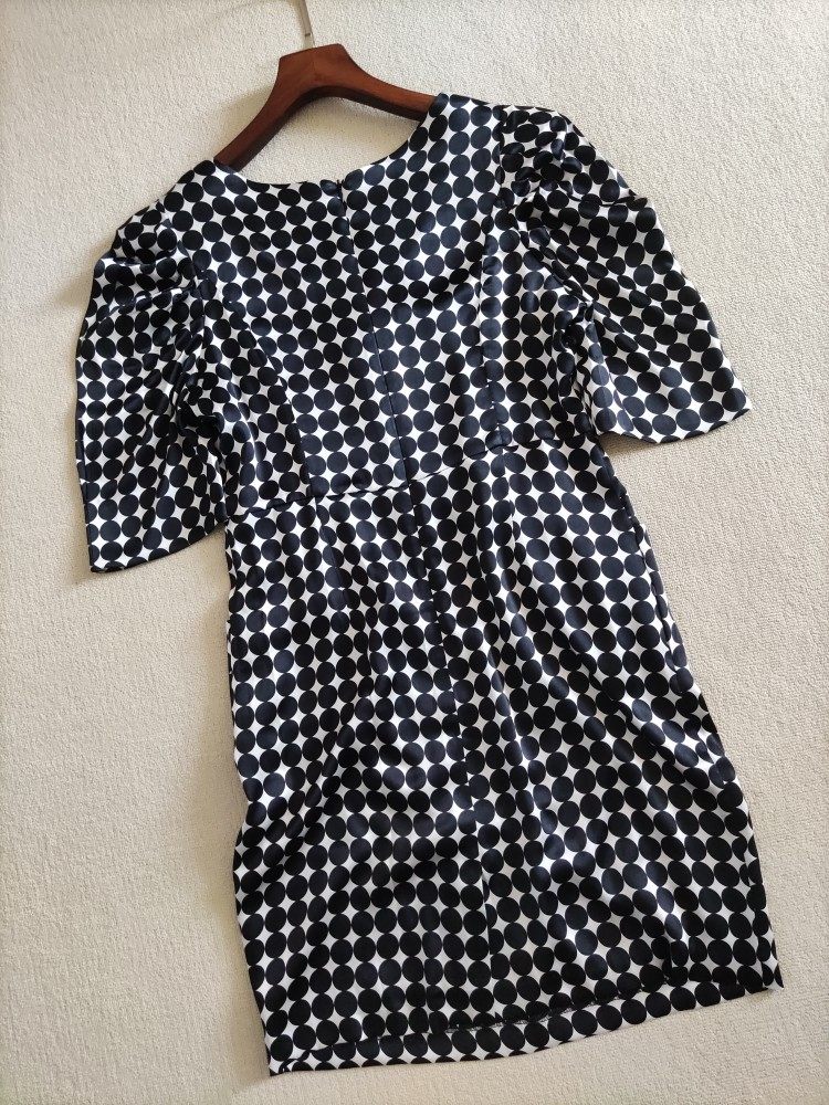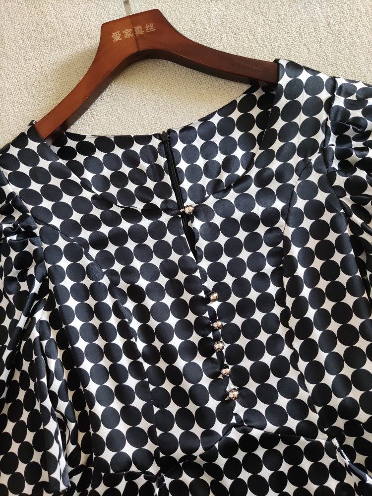 桑蚕丝弹力缎黑色波点中袖连衣裙女真丝时尚显瘦泡泡袖中长裙夏季