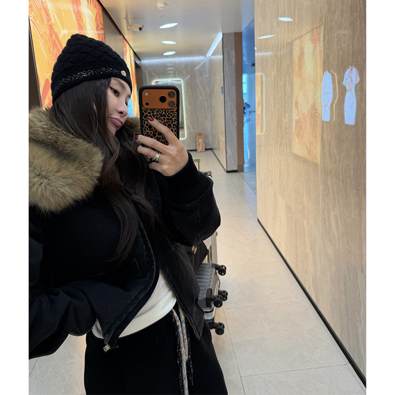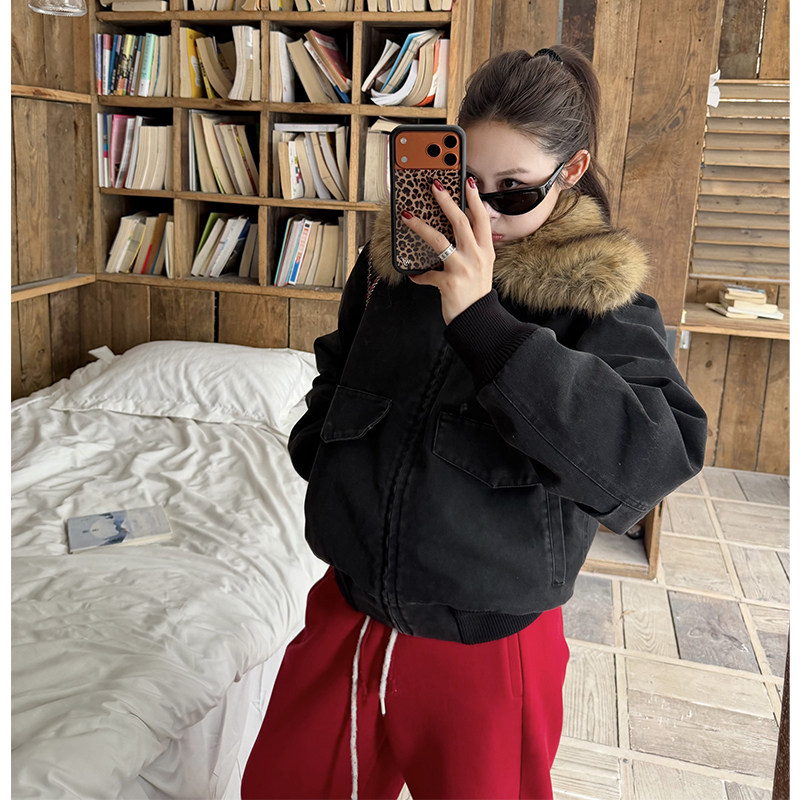 tingtings 黑色水洗布毛领棉服外套女冬季新款保暖夹棉夹克上衣