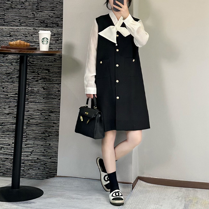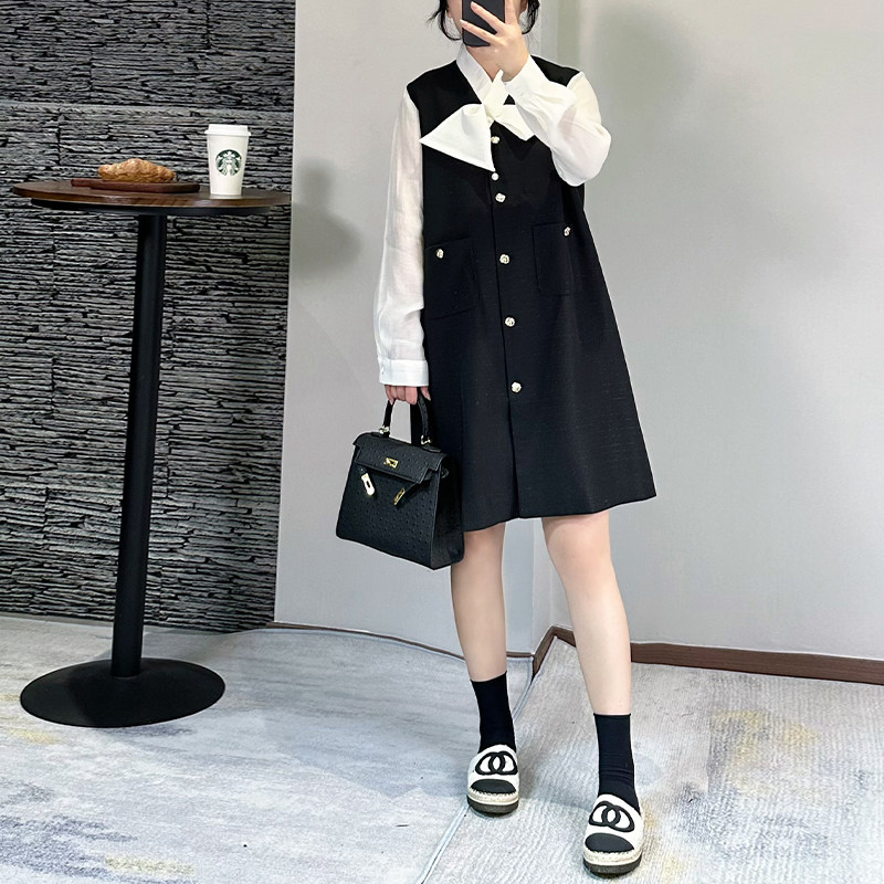 小香风撞色拼接连衣裙女2025秋季新款宽松长袖小个子裙子大码胖mm