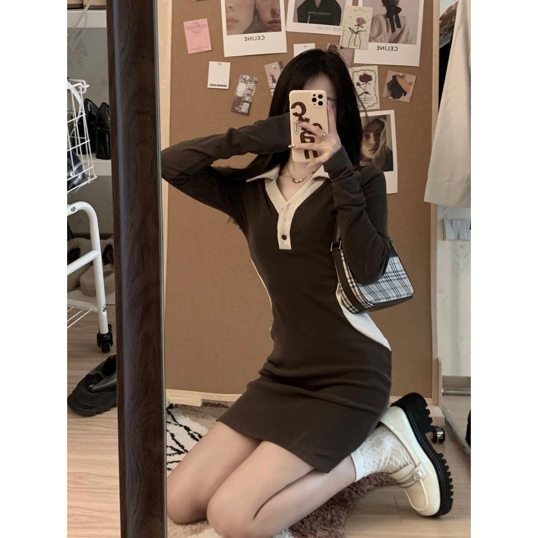 撞色polo领针织连衣裙女秋冬新款收腰显瘦辣妹包臀长袖打底短裙子