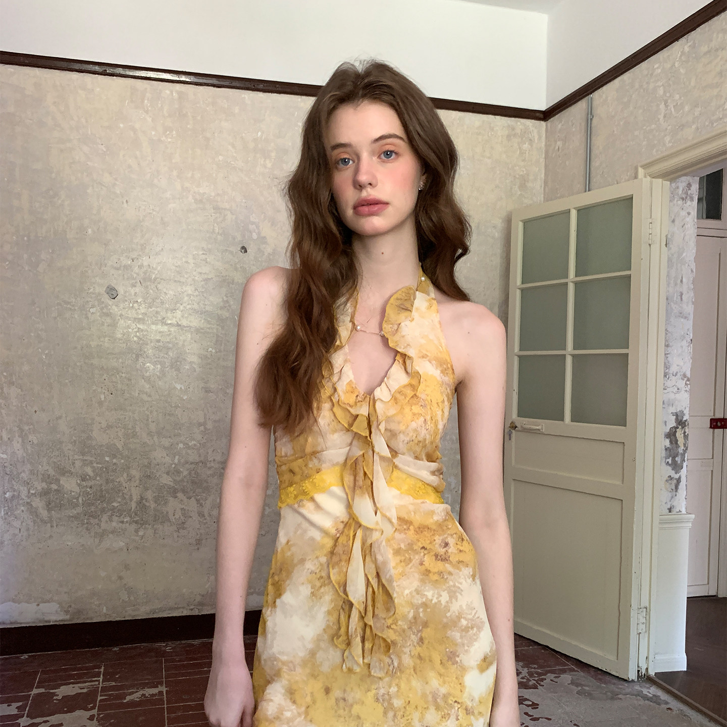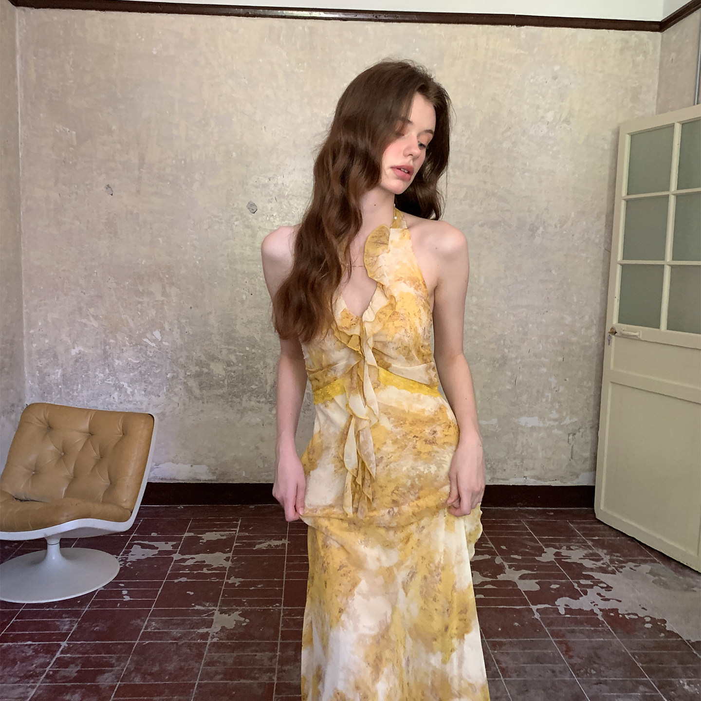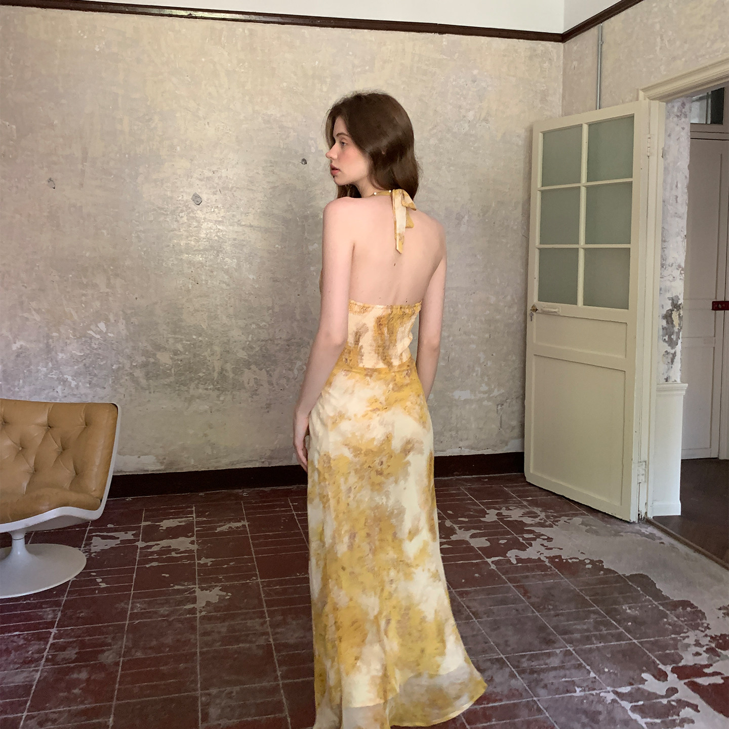 ZHUYIYI 新款高级感黄色挂脖连衣裙女夏收腰度假长裙露背印花法式