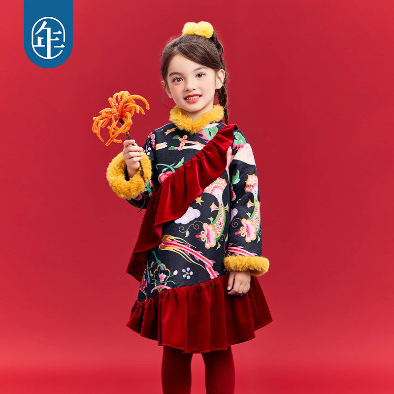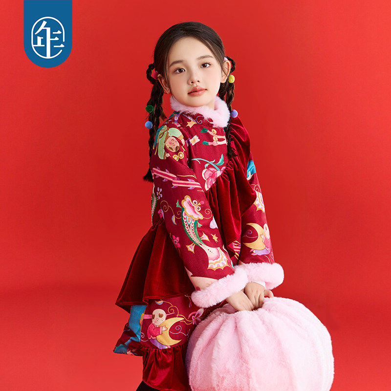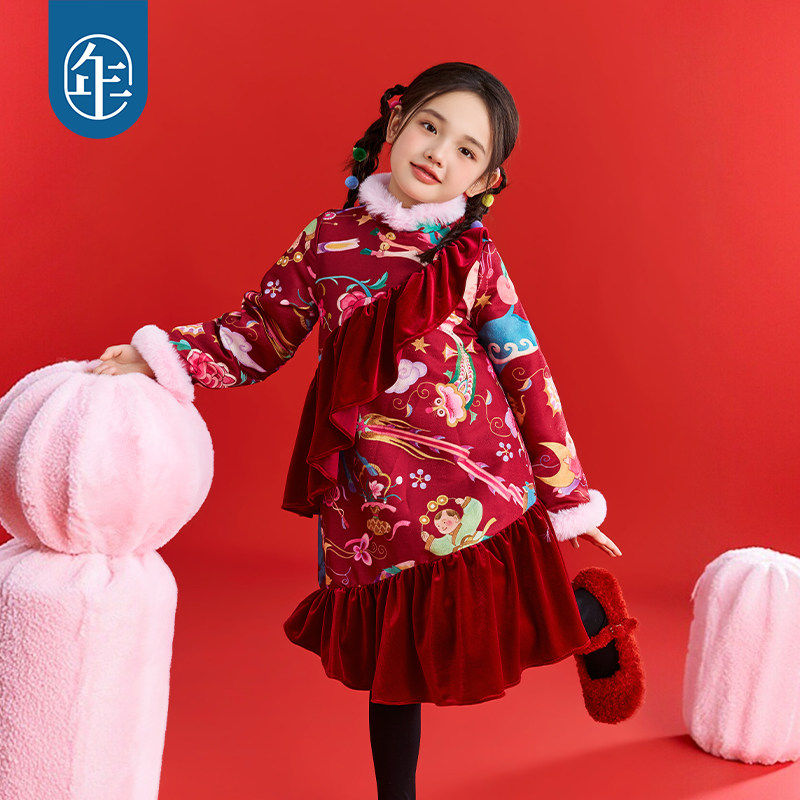 年衣童装中式公主裙女童冬季新品连衣裙国风加厚长袖旗袍裙演出服