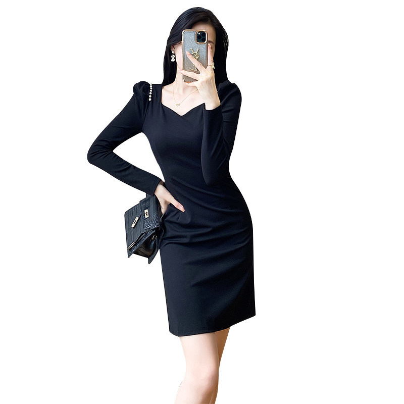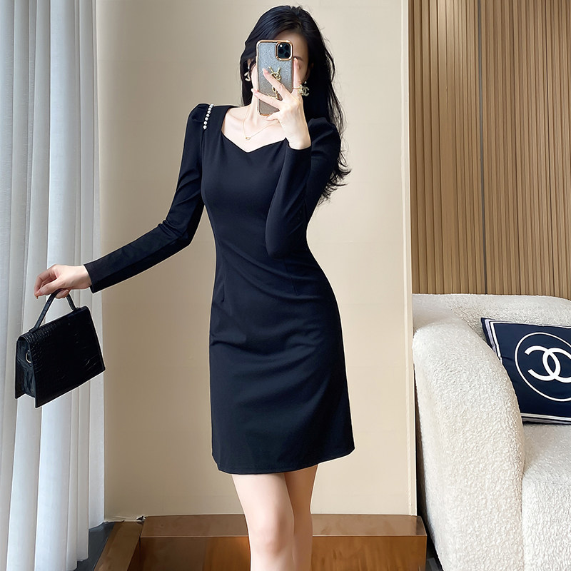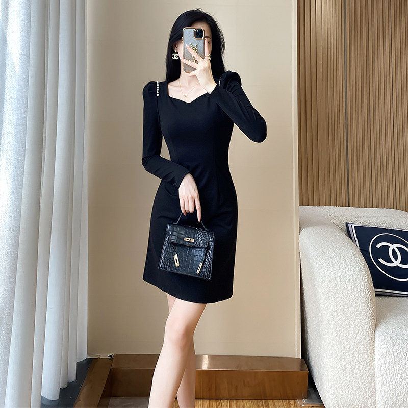秋装长袖赫本风小黑裙轻奢高级感女装修身短款连衣裙方领包臀裙子