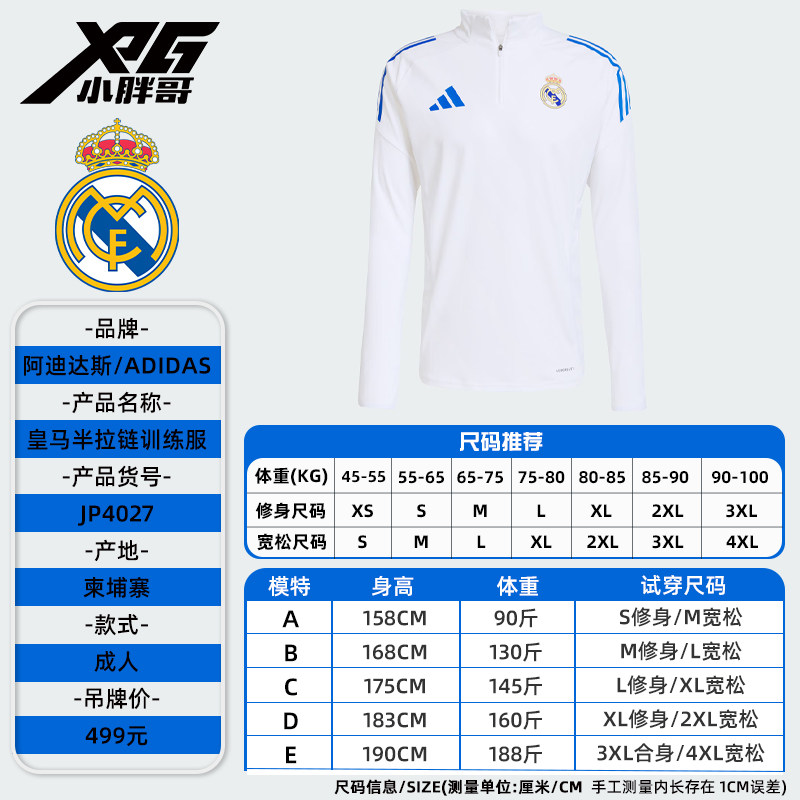 小胖哥XPG阿迪达斯25/26皇马赛前训练运动休闲长袖半拉链足球服男