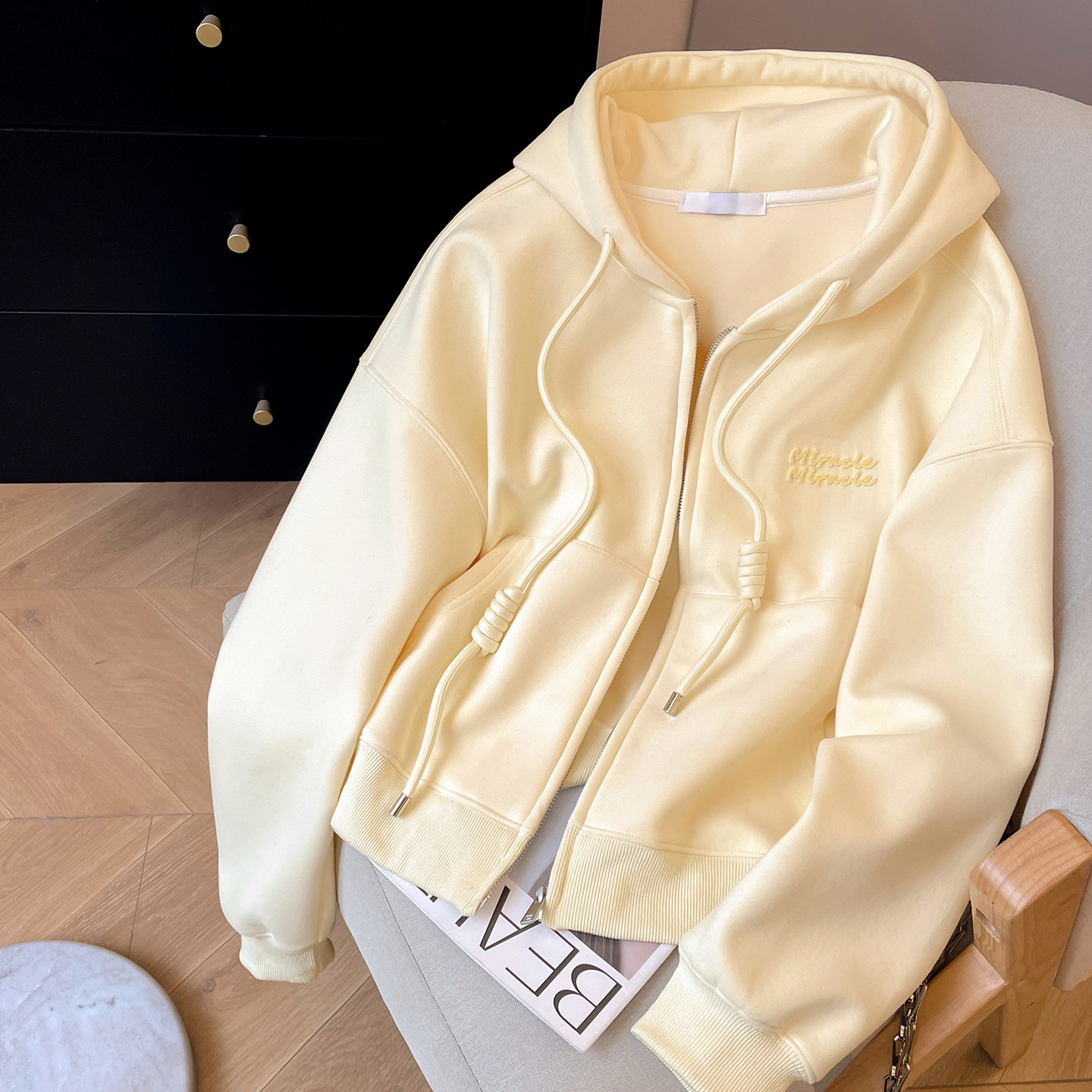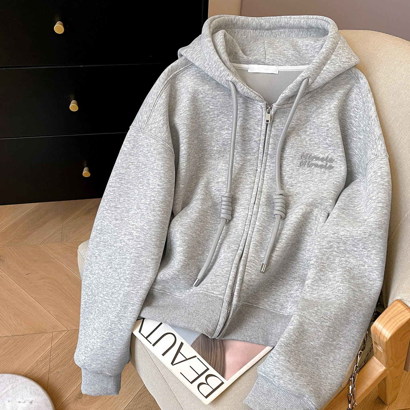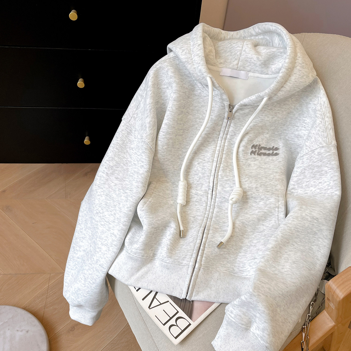 小C家 植绒字母连帽卫衣女款2026新款早春奶系学院风宽松拉链外套