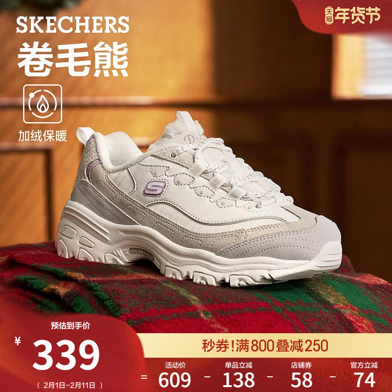 斯凯奇卷毛熊|冬季加绒熊猫鞋女鞋厚底增高老爹鞋休闲运动鞋棉鞋