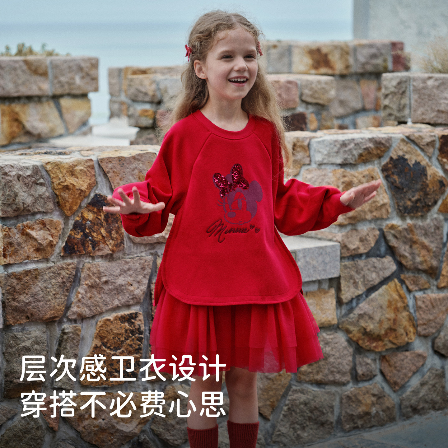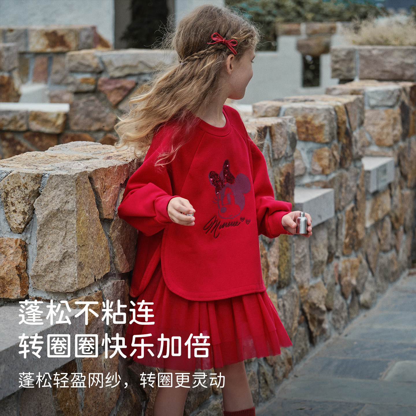 迪士尼IP戴维贝拉女童卫衣连衣裙2026冬装新款加绒儿童红裙子新年