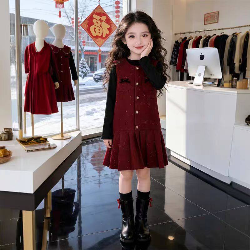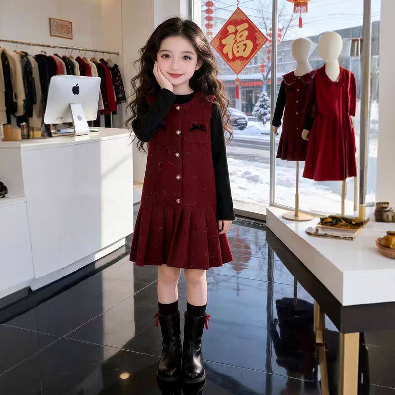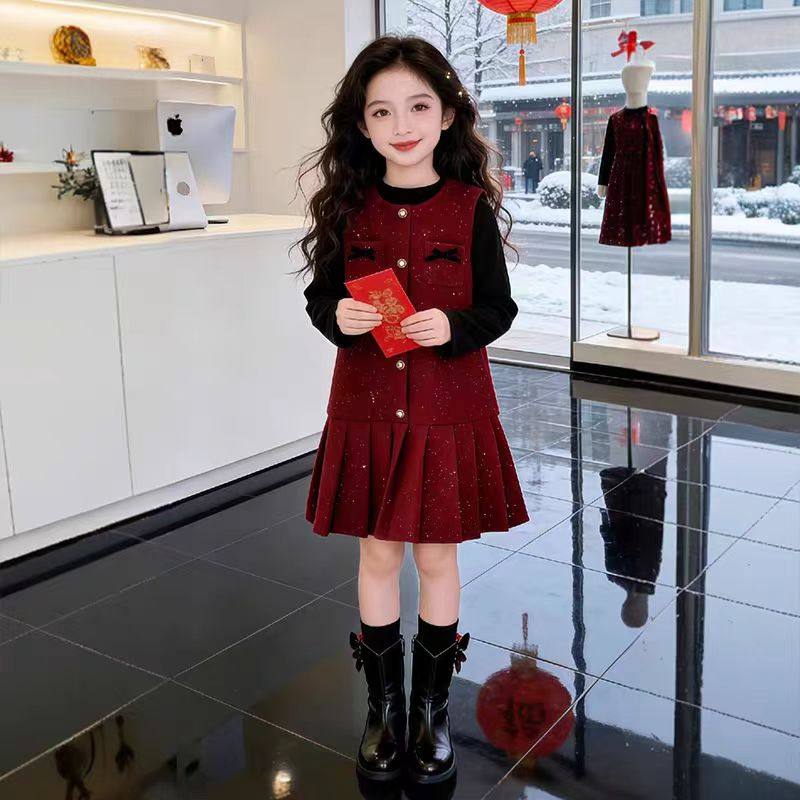女童冬季小香风连衣裙中大童毛呢亮片背心裙套装圣诞新年礼服裙子