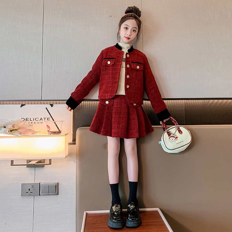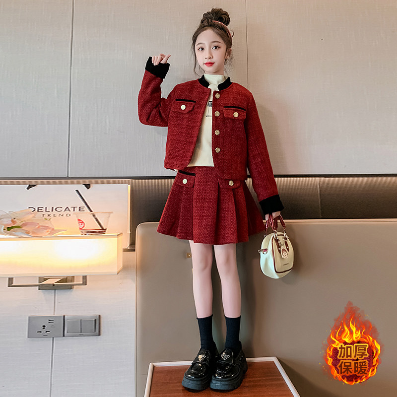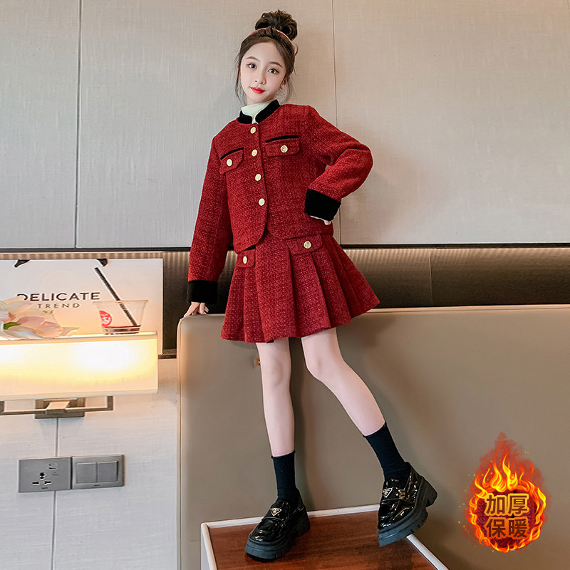 女童小香风套装秋冬款2025新款儿童红色连衣裙新年衣服过年服裙子