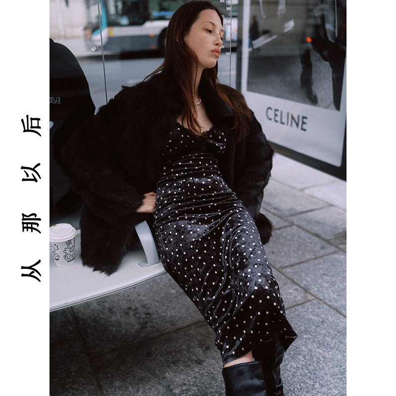 从那以后法式波点连衣裙秋冬穿搭丝绒裙吊带礼服长裙黑色小裙子女
