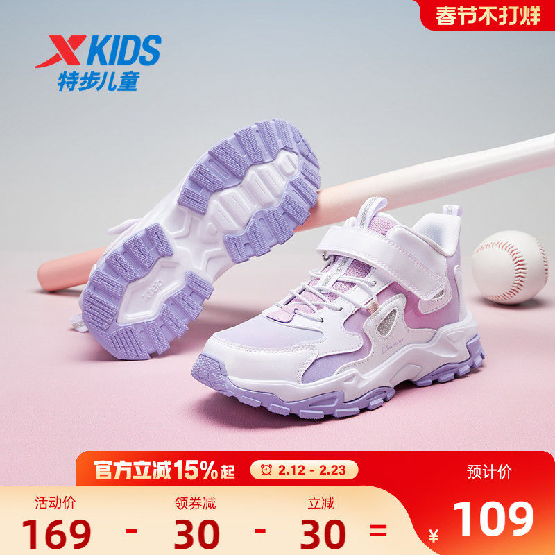 特步女童鞋冬季新款皮面魔术贴中大童儿童鞋加绒保暖运动鞋大棉鞋