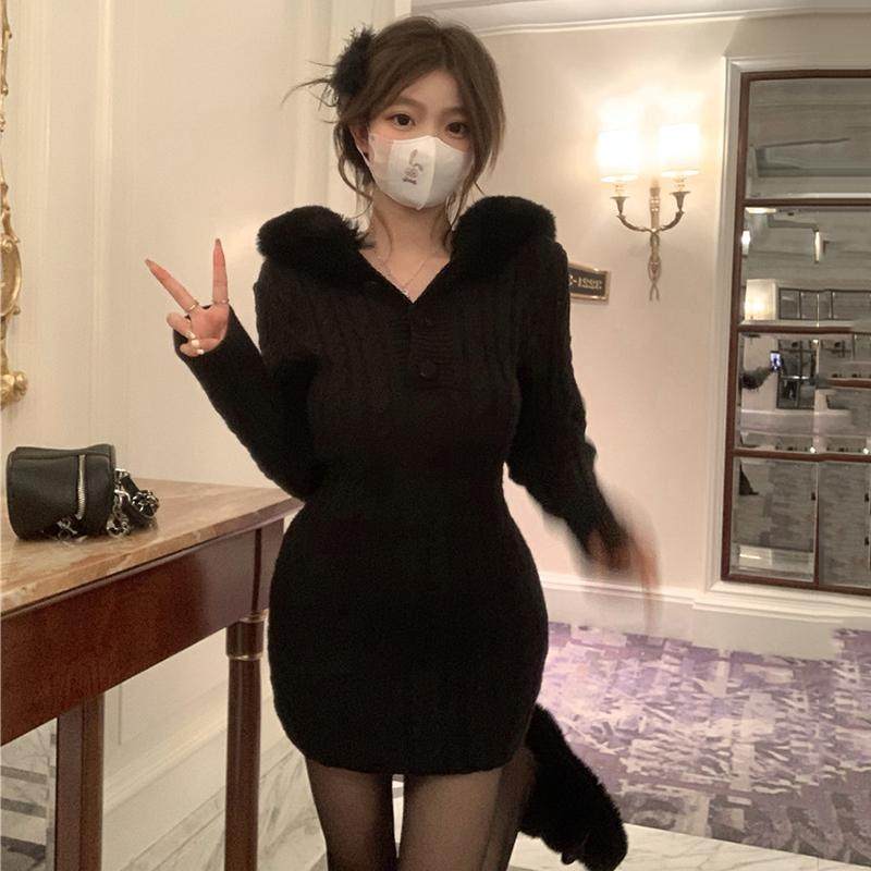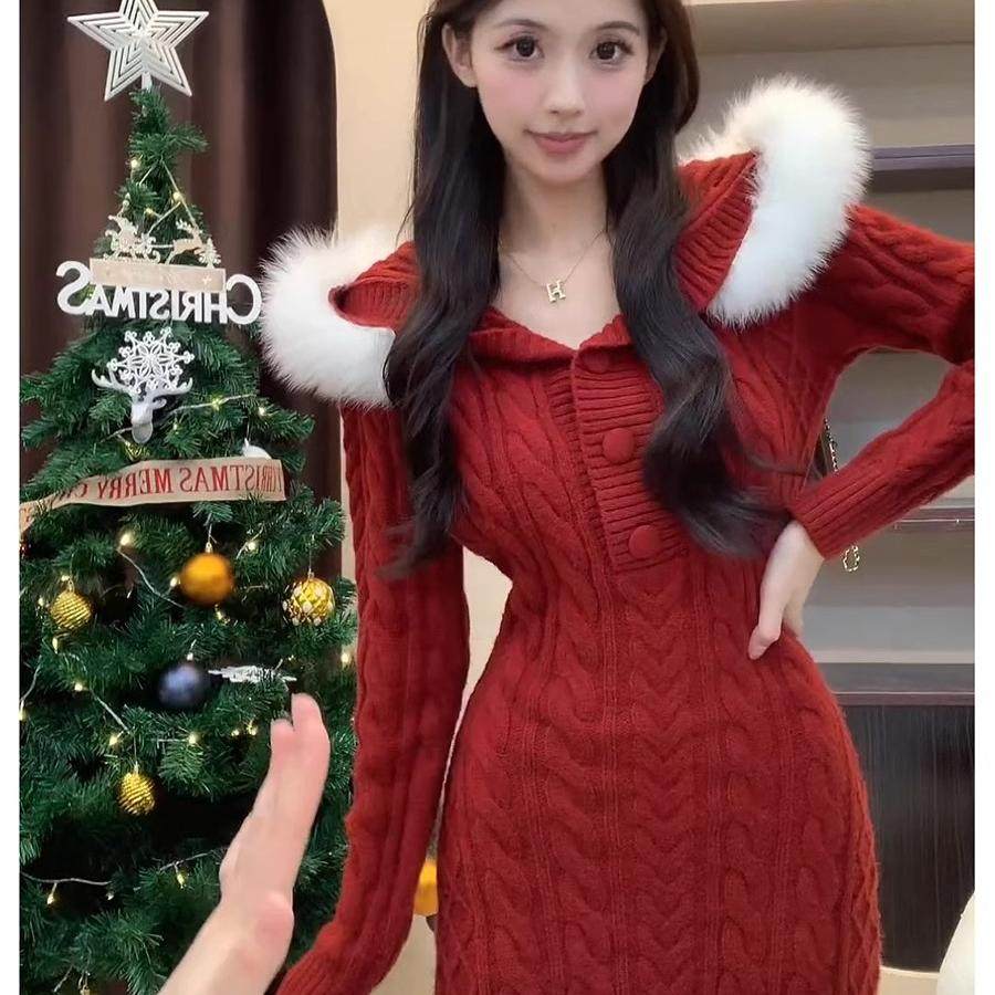 大码圣诞跨新年红色针织连衣裙女秋冬新款胖妹妹小个子毛衣包臀裙
