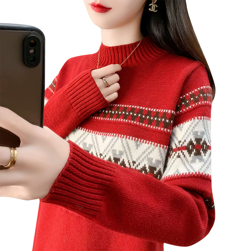 毛衣女款2025新款冬季内搭复古红色上衣时尚加绒加厚打底衫女秋冬