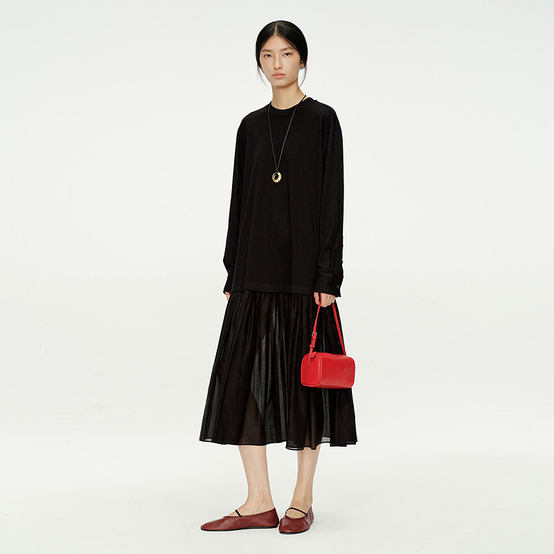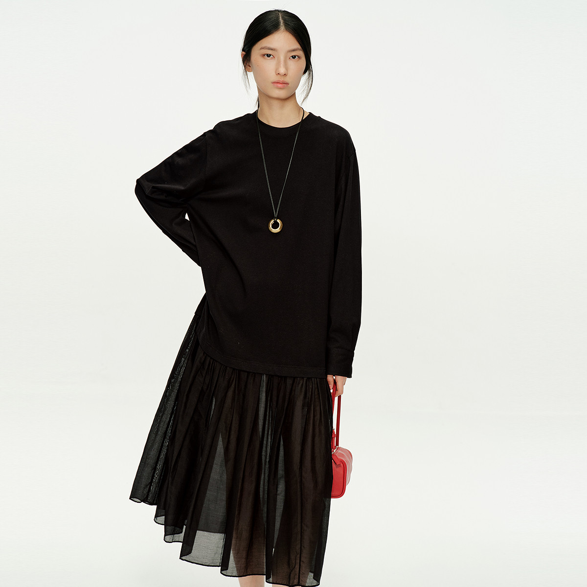 MESUX米岫25冬汉麻丝绵拼接直筒版型黑色长袖针织连衣裙MNWUO601
