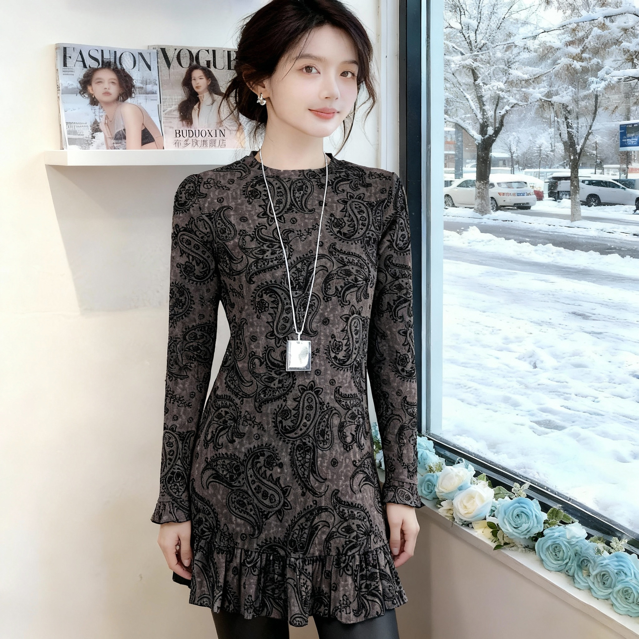 腰果印花加绒加厚t恤打底连衣裙女2026秋冬新款小个子中长款上衣