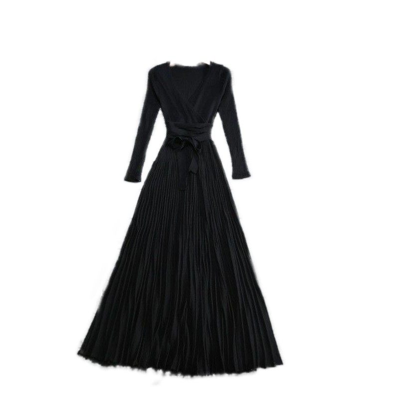 到脚踝的长款春装连衣裙 赫本风毛线打底裙 针织收腰显瘦大摆长裙